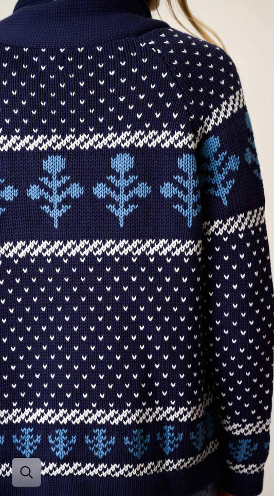 Marea Flower Intarsia Shawl Cardigan - Navy