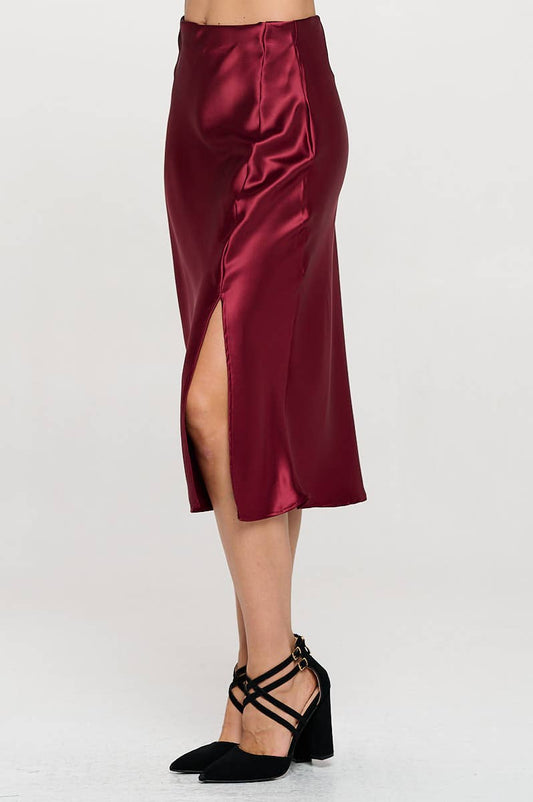 Burgundy Satin Midi Skirt with Slit (Made in USA)