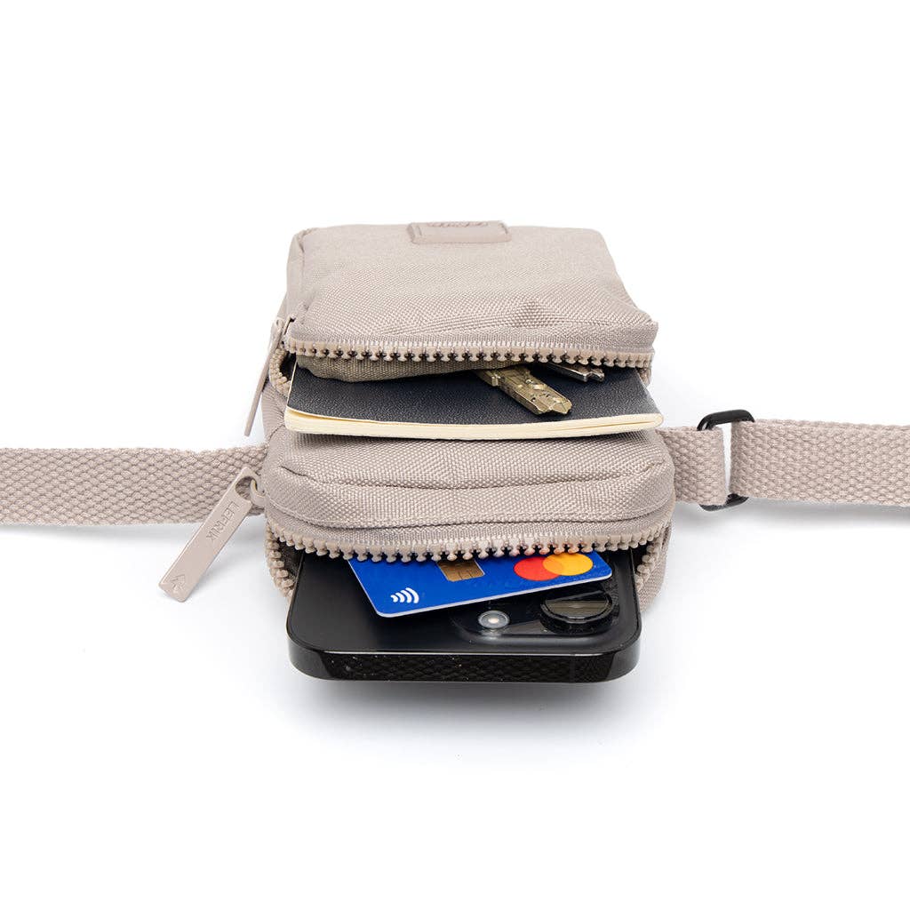 Rectangular shoulder bag to carry only the essentials. It has two separate compartments for better organisation. Holds phones up to 7". Zipped clousure. Lightweight and adjustable cotton strap.