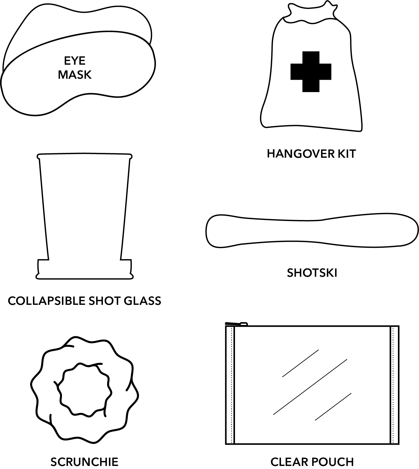 Aprés all day with the Aprés Ski Set by Pinch Provisions. Whether you're actually hitting the slopes, or just feeling the mountain vibes, this 6-piece set is the perfect collection of chalet-chic essentials, packed in a clear flat pouch with silver vegan leather trim. Keep the party going with a personal 8-in. shot-ski with collapsible stainless steel shot glass. Then snuggle up with an ivory sherpa sleep mask and scrunchie. And finally, keep the mini hangover kit with pain reliever, electrolytes, facial cleaning towelette, and breath drops close-by the next morning. With the Pinch Aprés Ski Set, you'll be ready to hit the slopes again in no time.