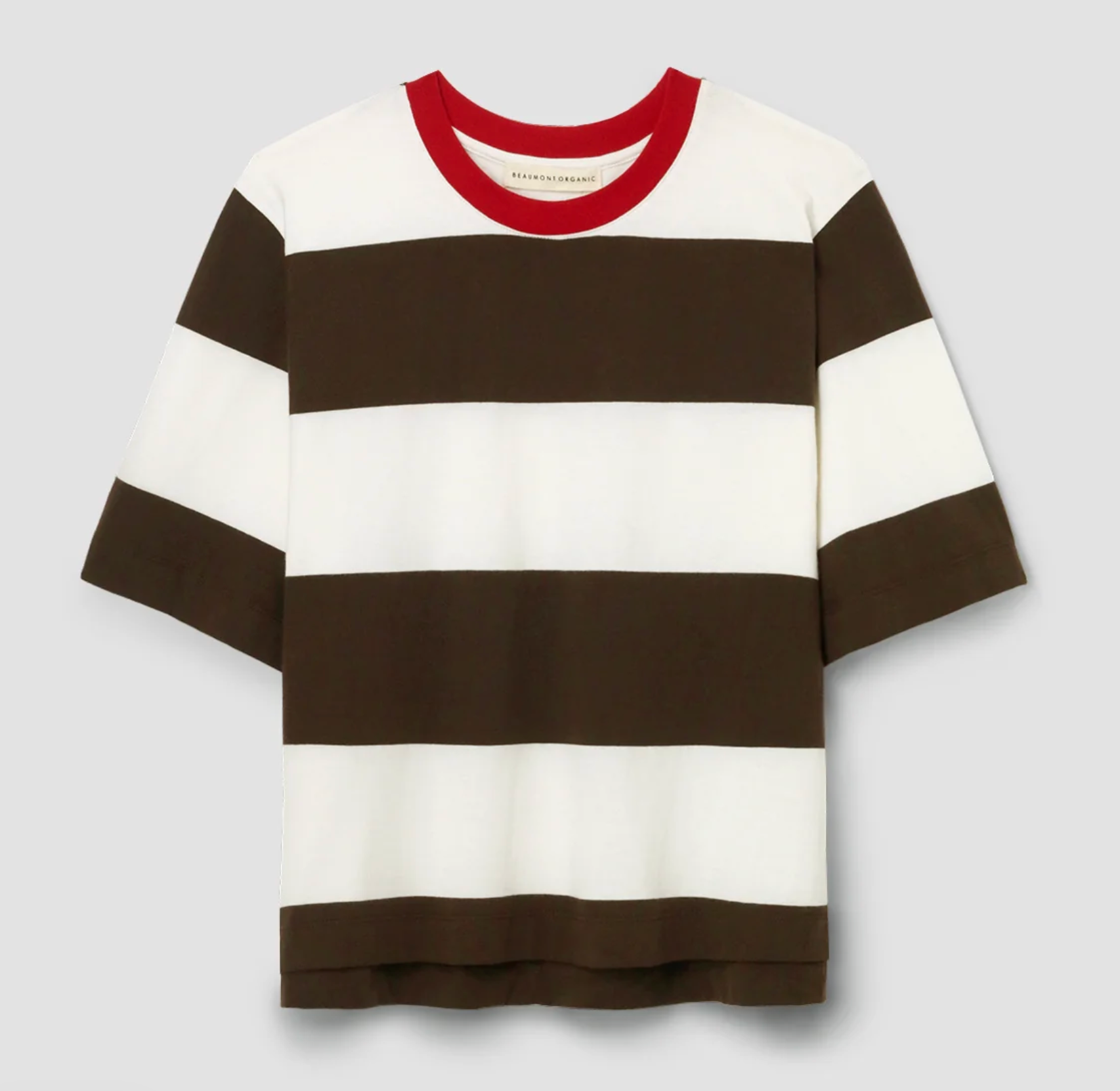 The Bay-Sue is a boxy fit T-shirt with a ribbed contrast collar, dipped hem and wide sleeves.