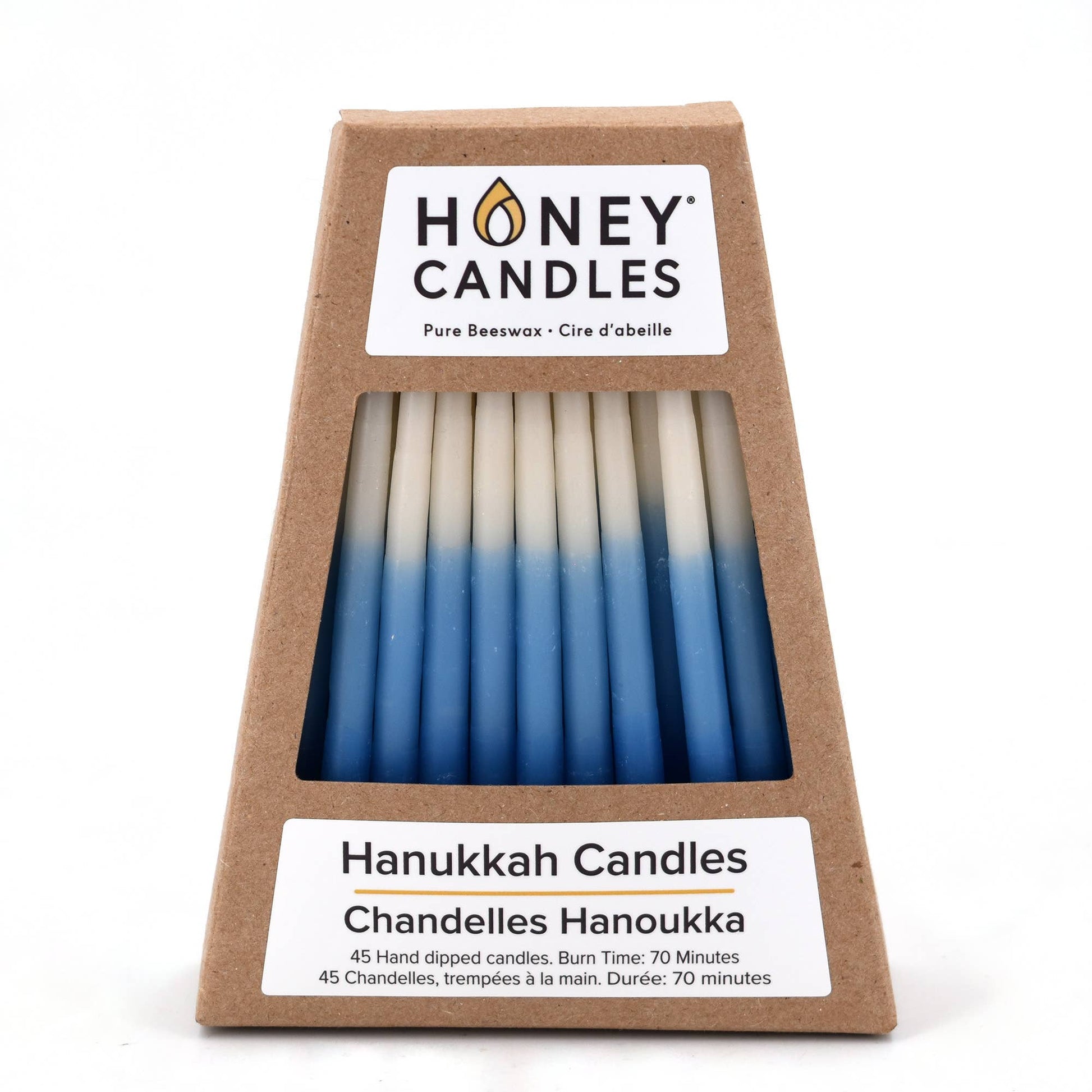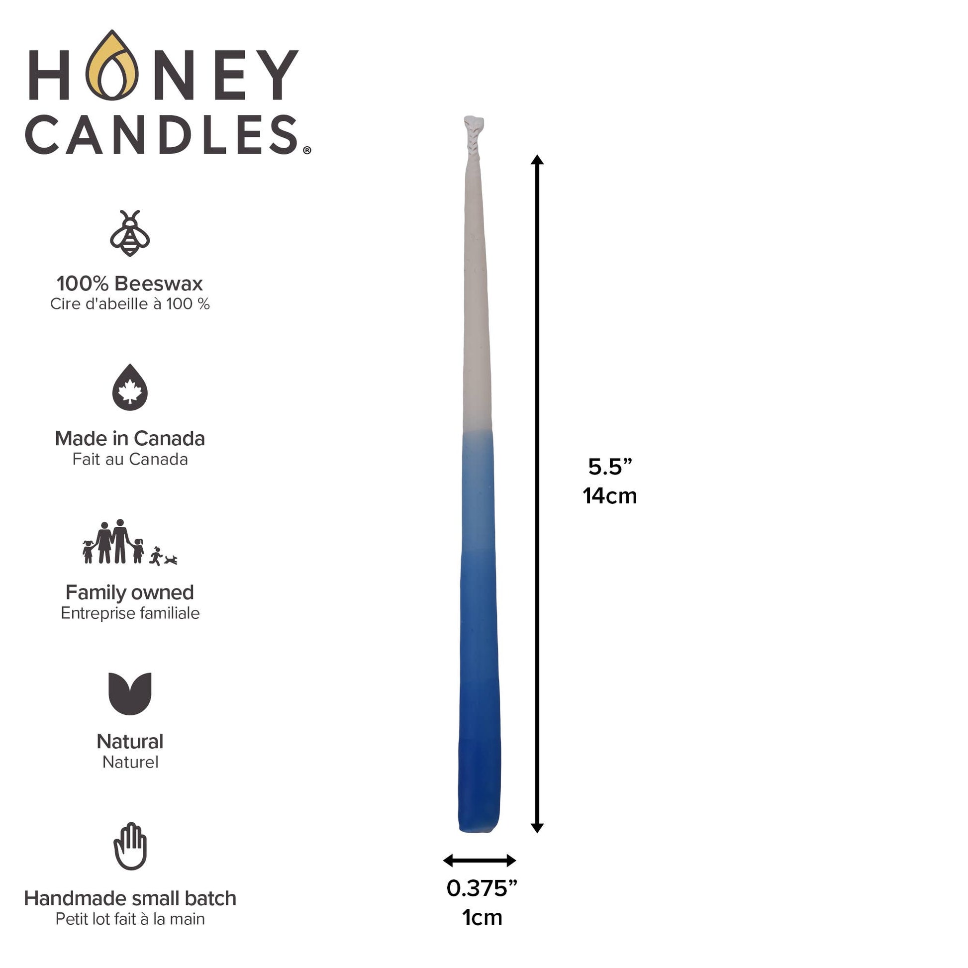 Honey Candles® 100% pure beeswax Hanukkah, (Chanukah) Candles in a beautiful pure Pearl beeswax that is then over dipped with Honey Candles® Blue beeswax color. The common size of 5" x .38" fits most menorahs.