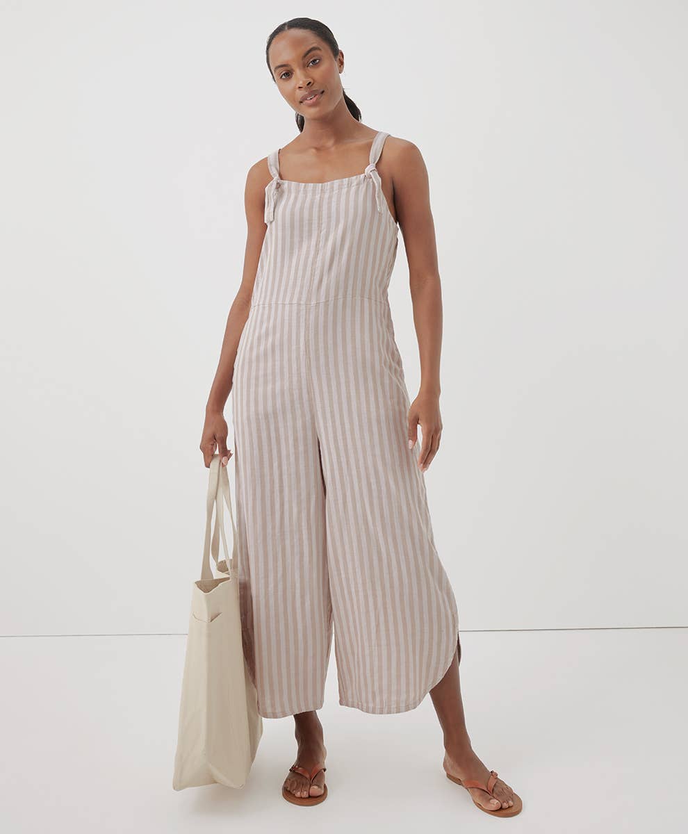 The Coastal Tie-Strap Jumpsuit is a versatile style that feels soft, breezy, and oh-so beachy. Pairs just as well with sneakers and a tote bag as it does with sandals and a sun hat. Woven, double-gauze fabric creates a flowy silhouette. Square apron neckline. Knotted straps so you can find the perfect fit. Stitched through on-seam pockets. Exaggerated curved hem. Wide leg, hits mid-calf on most. This fabric is processed at lower temperatures, saving water and energy use in manufacturing. Because of this, there are slight variations in saturation of colors making each piece unique.. We recommend ordering your true size.. Inseam Length, All Sizes: 26". GOTS Organic Certified by Control Union 832196 .Machine wash cold. Line dry, do not dry clean.