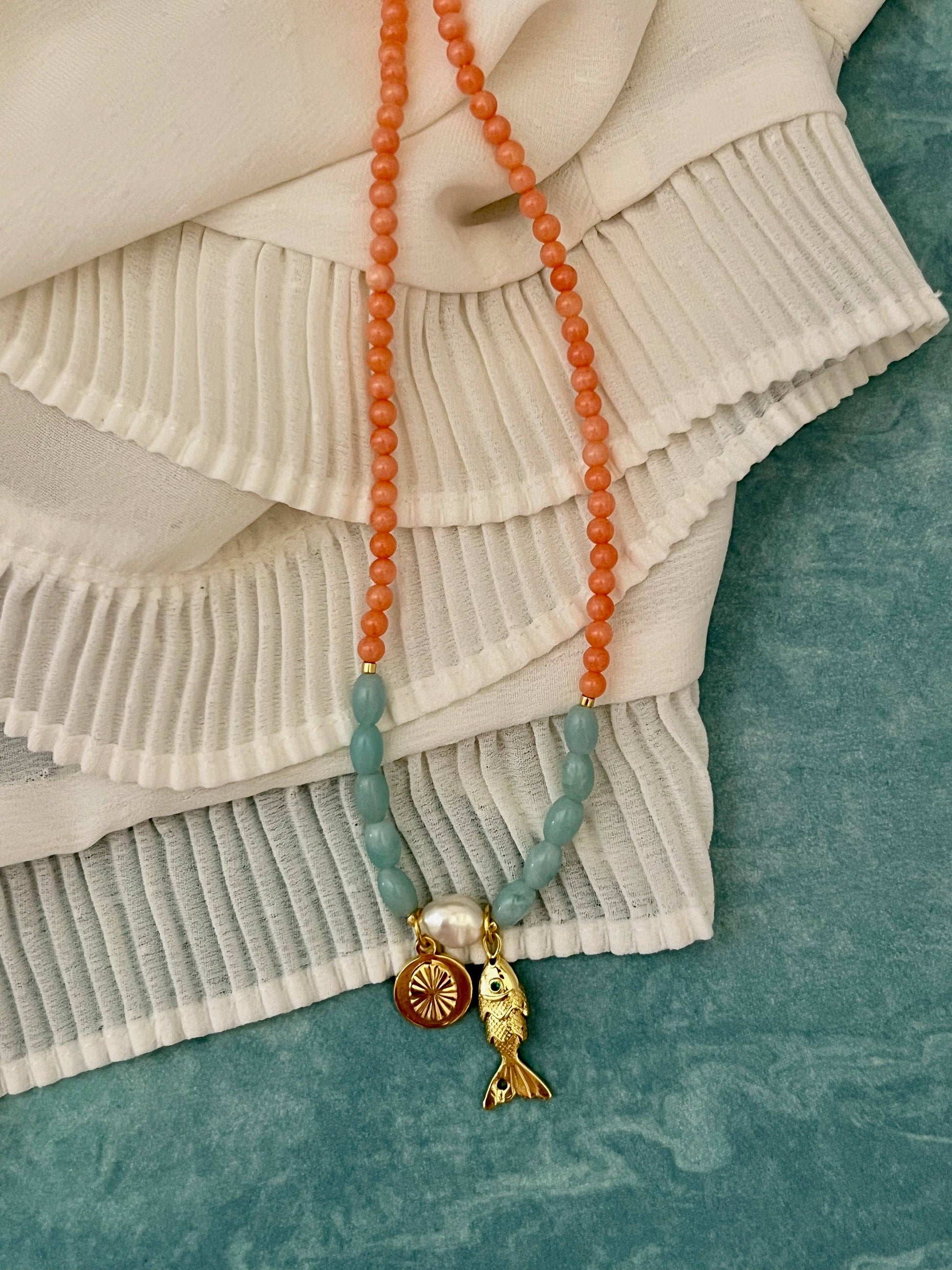 The Cora Necklace features Bamboo Coral and Amazonite arranged in a balanced color block design, highlighted by a central pearl. It is adorned with two delicate charms: a tiny medallion and an articulated fish with a striking green eye!