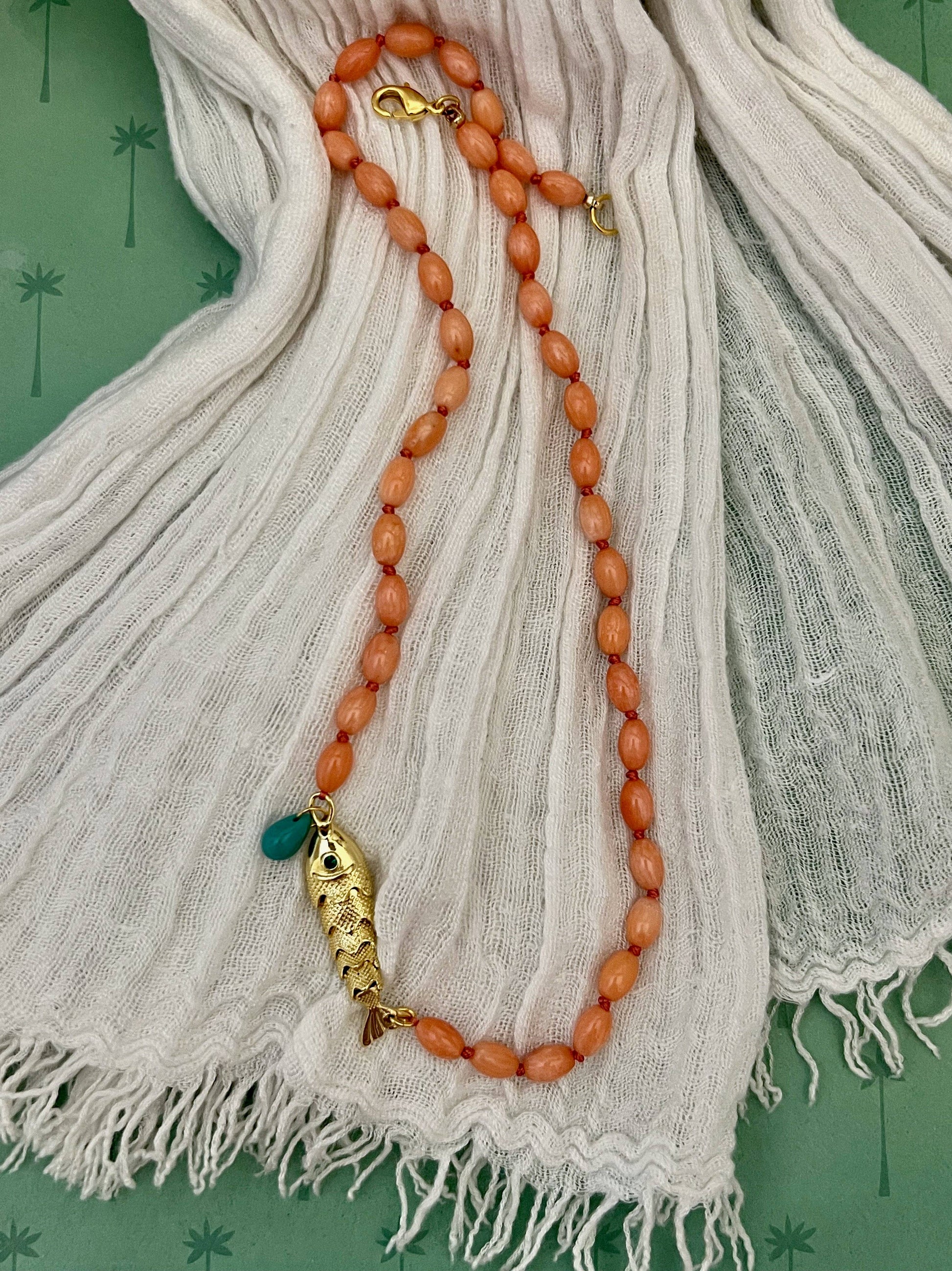This knotted Bamboo Coral necklace is highlighted by a charming articulated fish detail on the side, making it an ideal choice to complete your summer neck stack.