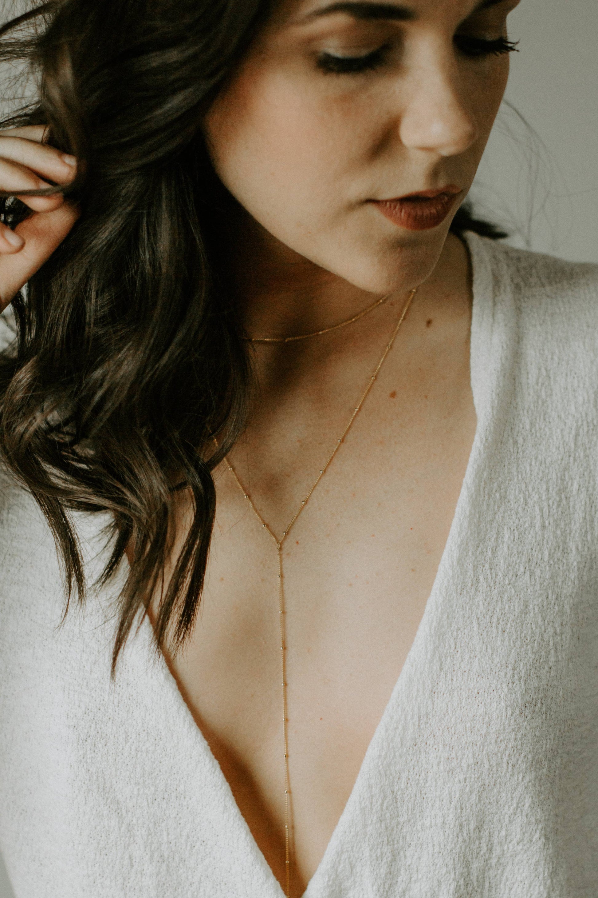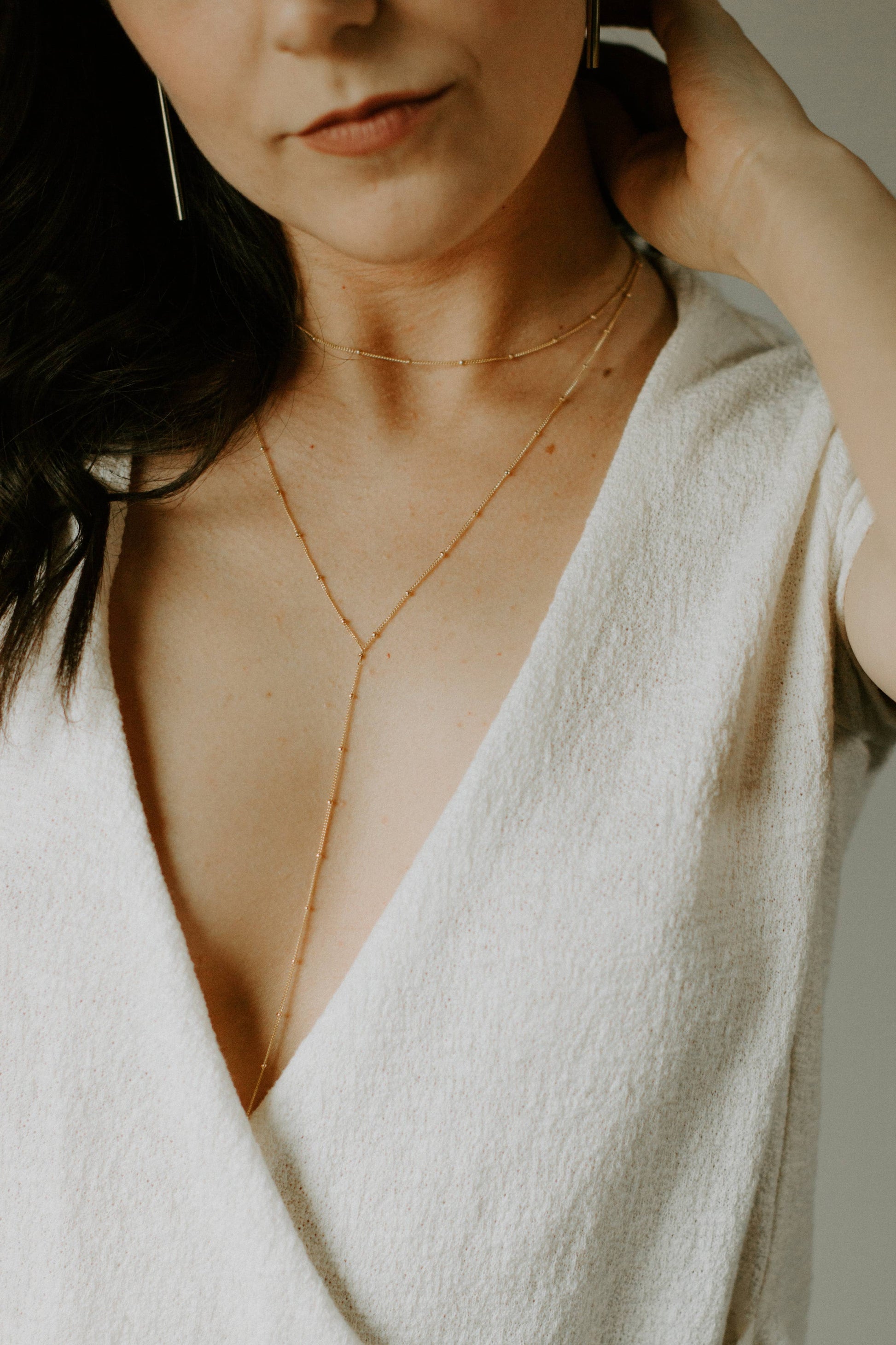 A long elegant chain that can be worn as a necklace or doubled up to make a choker.