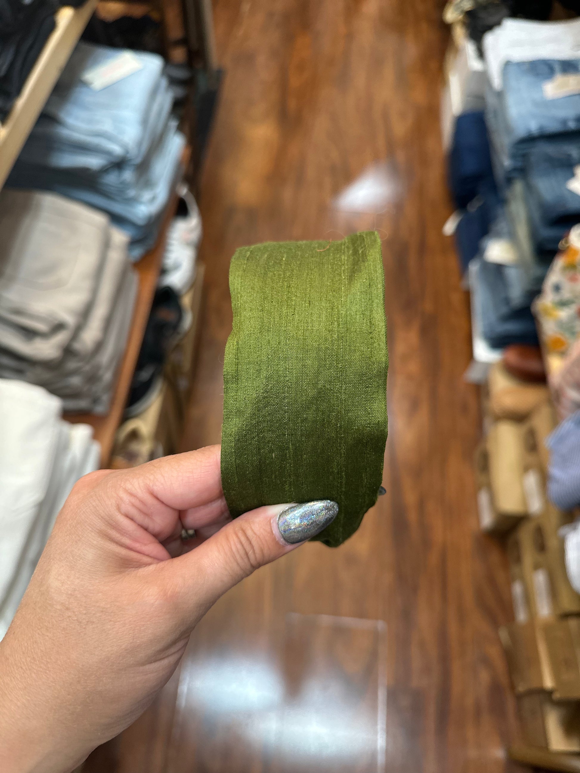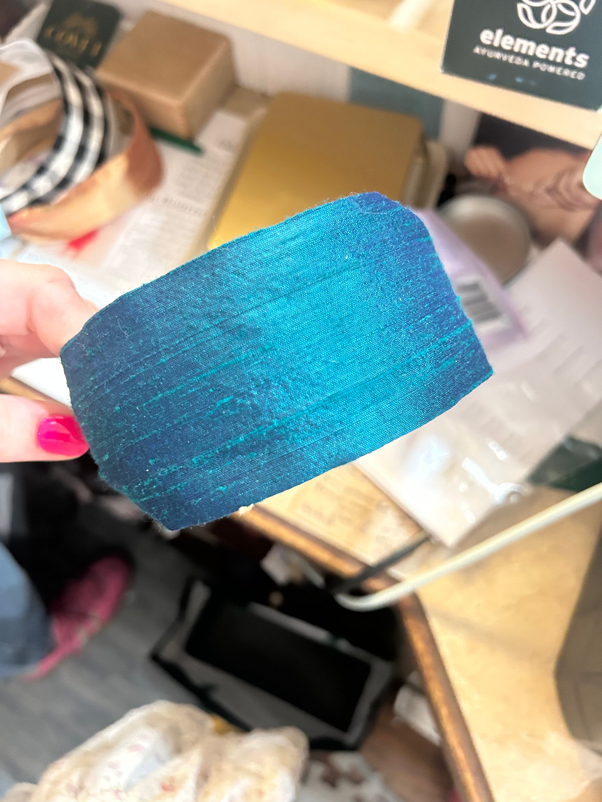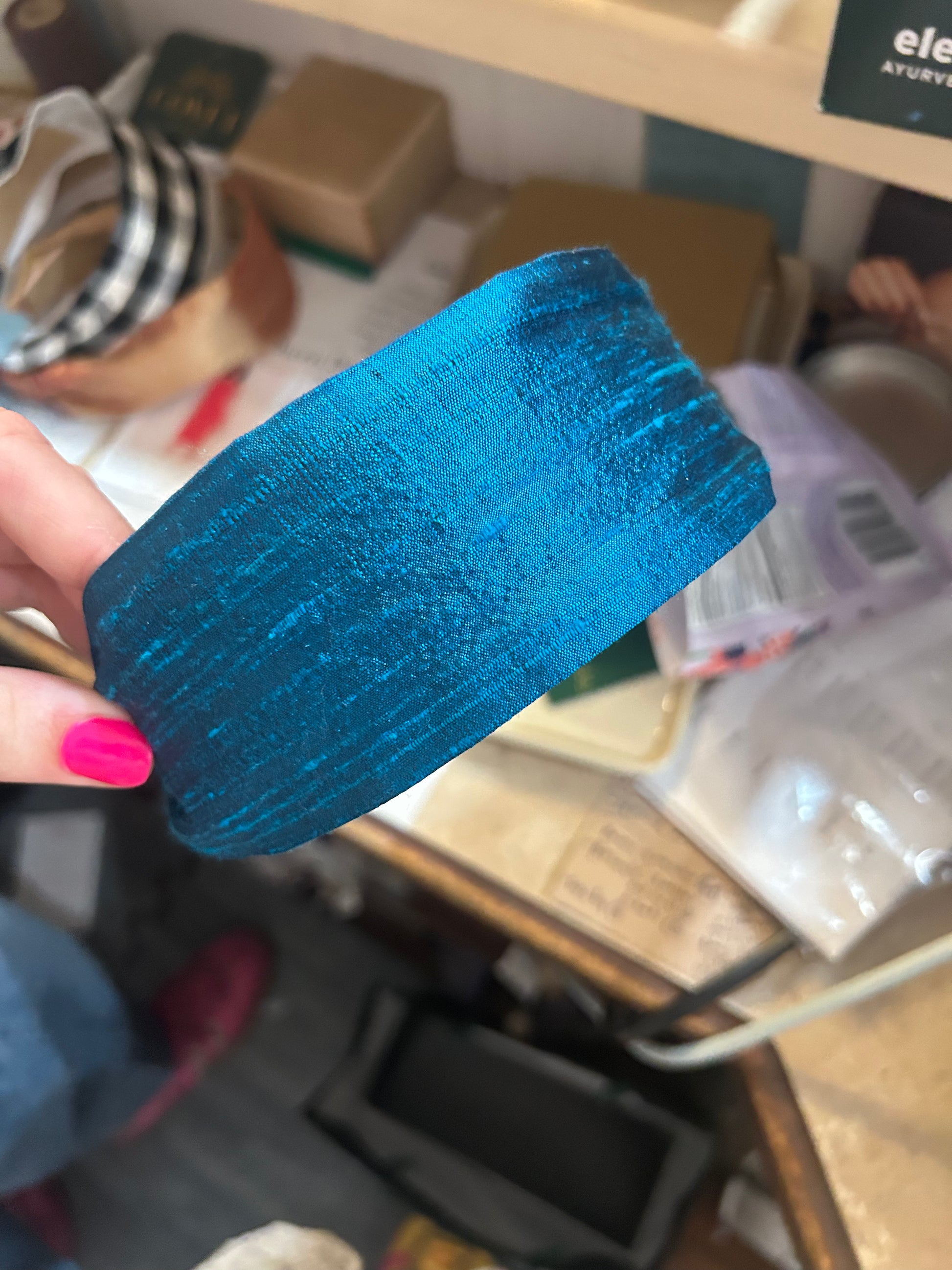 The classic 2" headband measures 2" at its widest (top of head) and tapers down to 3/4" at the ends (behind the ears). From end to end the headband measures 14.5". It's tight enough for a good grip but loose enough to avoid headaches. Classic headbands have a top piece of fabric (solid silk or pattered cotton) and bottom piece of fabric (solid cotton) that are sewn together and glued on to the headband form, which is made of a pliable and soft plastic. The glue used is non-toxic and washable. The headband form is visible from the bottom side of the headband. Great for a bad hair day or to spruce up any hairdo. The pictured headband stack, from top to bottom, shows NAVY, PEACOCK, TUSCAN OLIVE, SWISS CHARD, ANEMONE