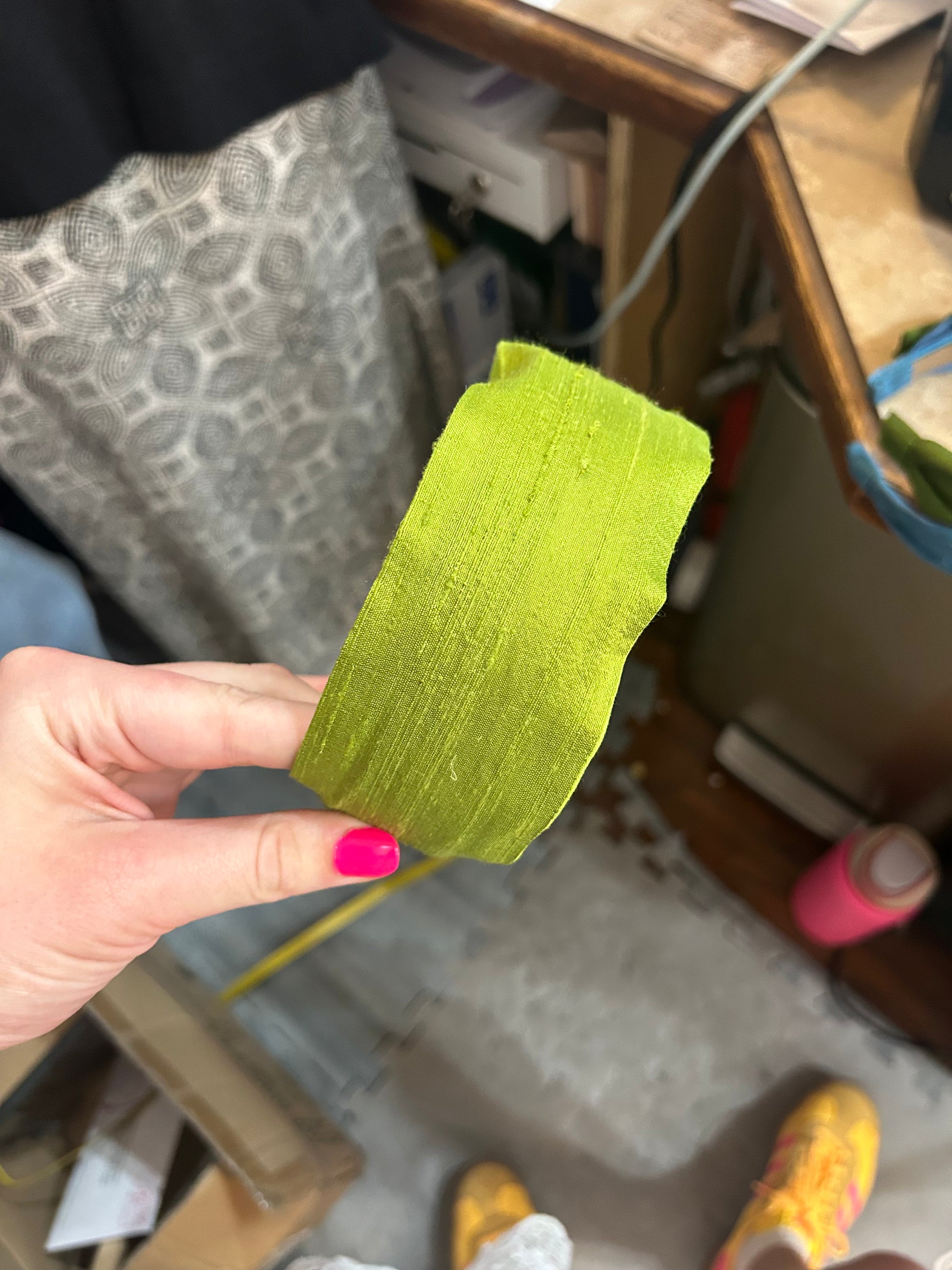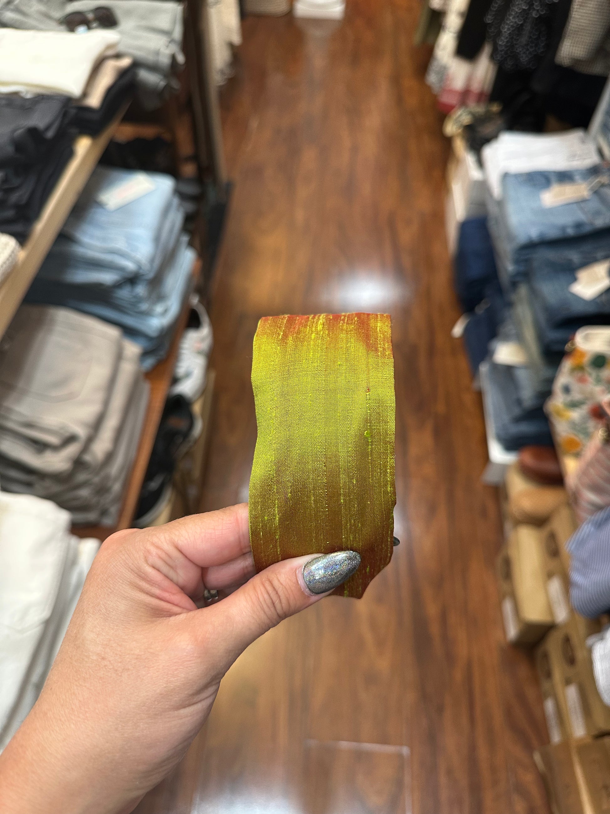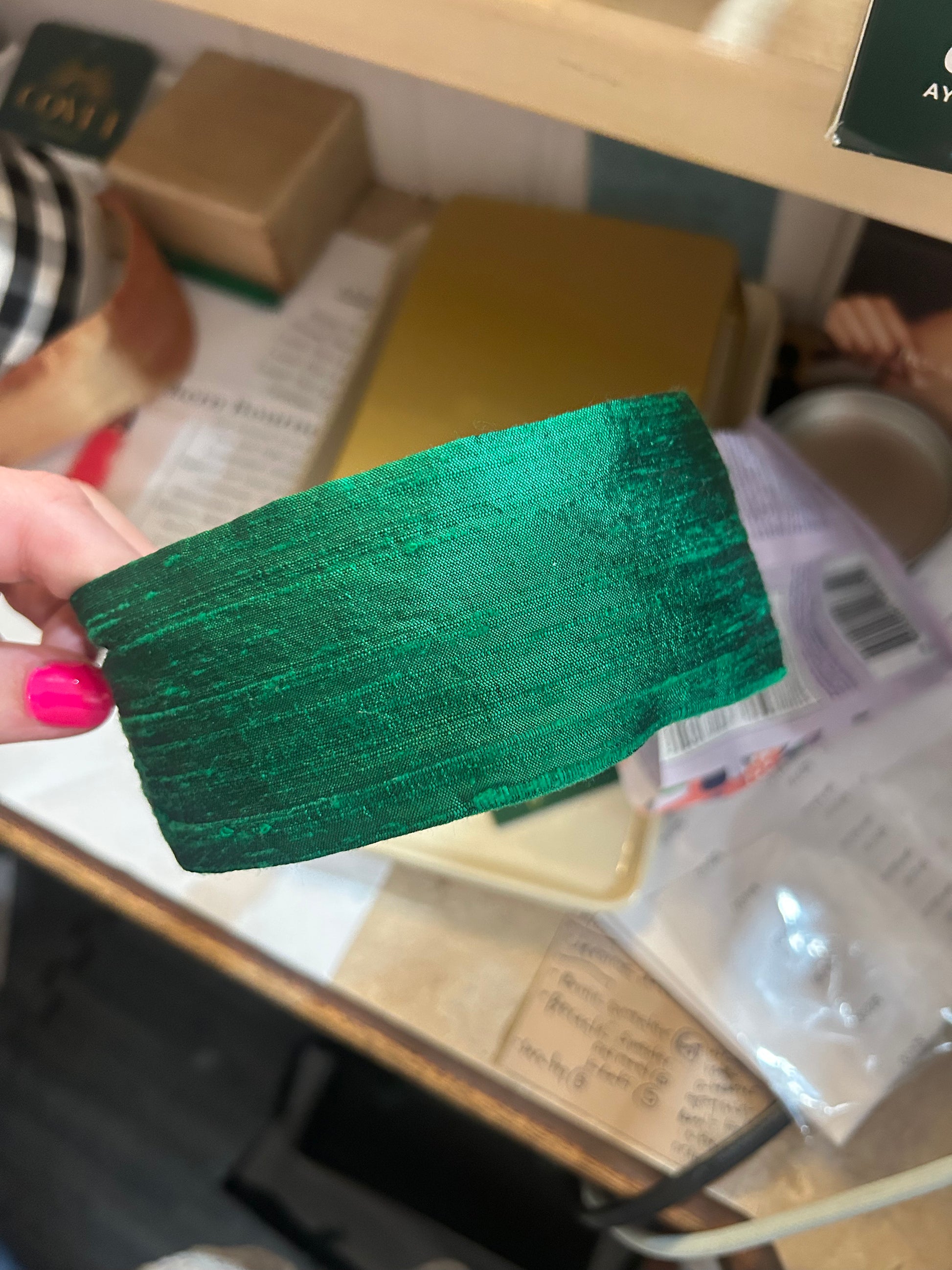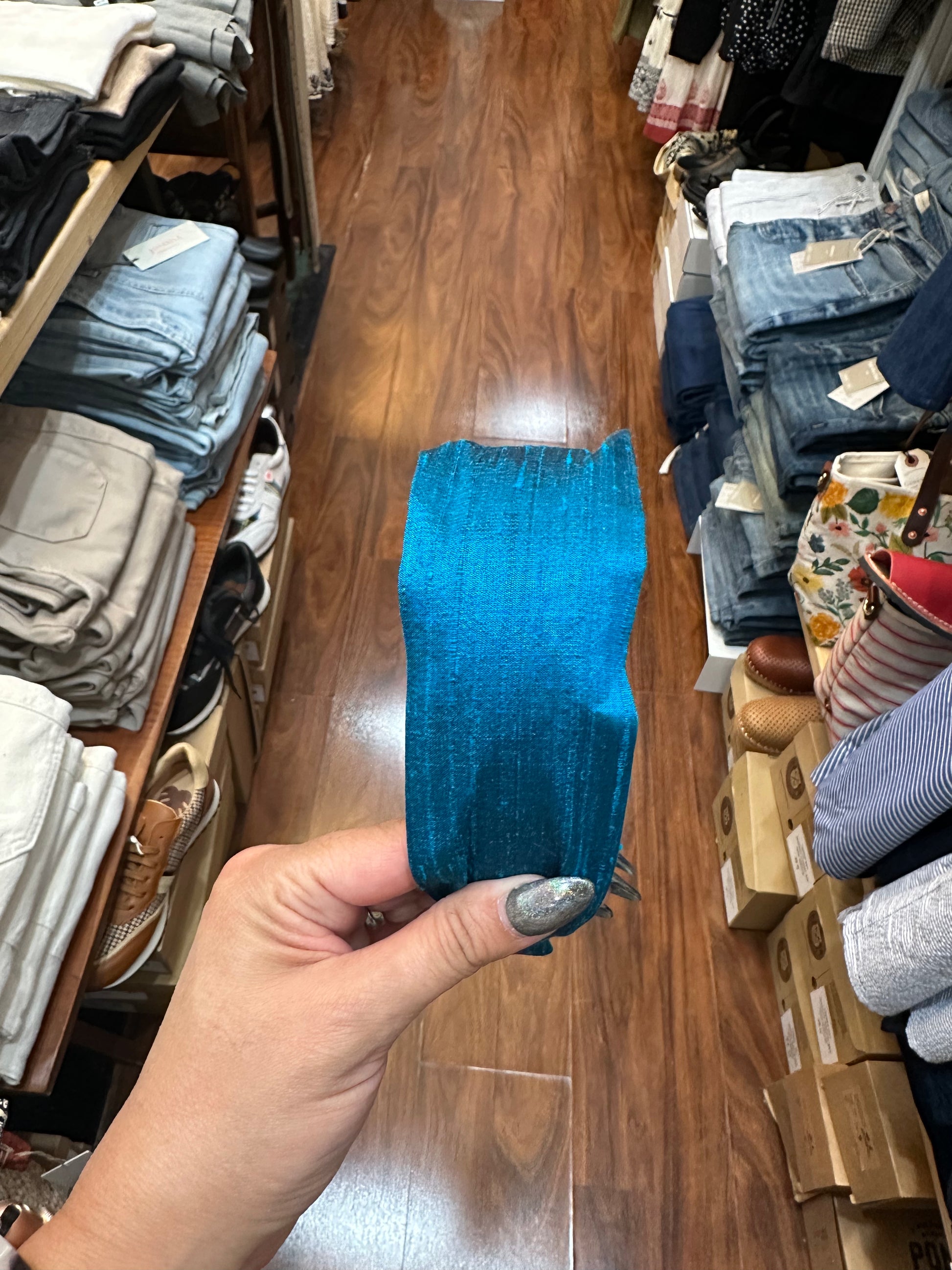 The classic 2" headband measures 2" at its widest (top of head) and tapers down to 3/4" at the ends (behind the ears). From end to end the headband measures 14.5". It's tight enough for a good grip but loose enough to avoid headaches. Classic headbands have a top piece of fabric (solid silk or pattered cotton) and bottom piece of fabric (solid cotton) that are sewn together and glued on to the headband form, which is made of a pliable and soft plastic. The glue used is non-toxic and washable. The headband form is visible from the bottom side of the headband. Great for a bad hair day or to spruce up any hairdo. The pictured headband stack, from top to bottom, shows NAVY, PEACOCK, TUSCAN OLIVE, SWISS CHARD, ANEMONE