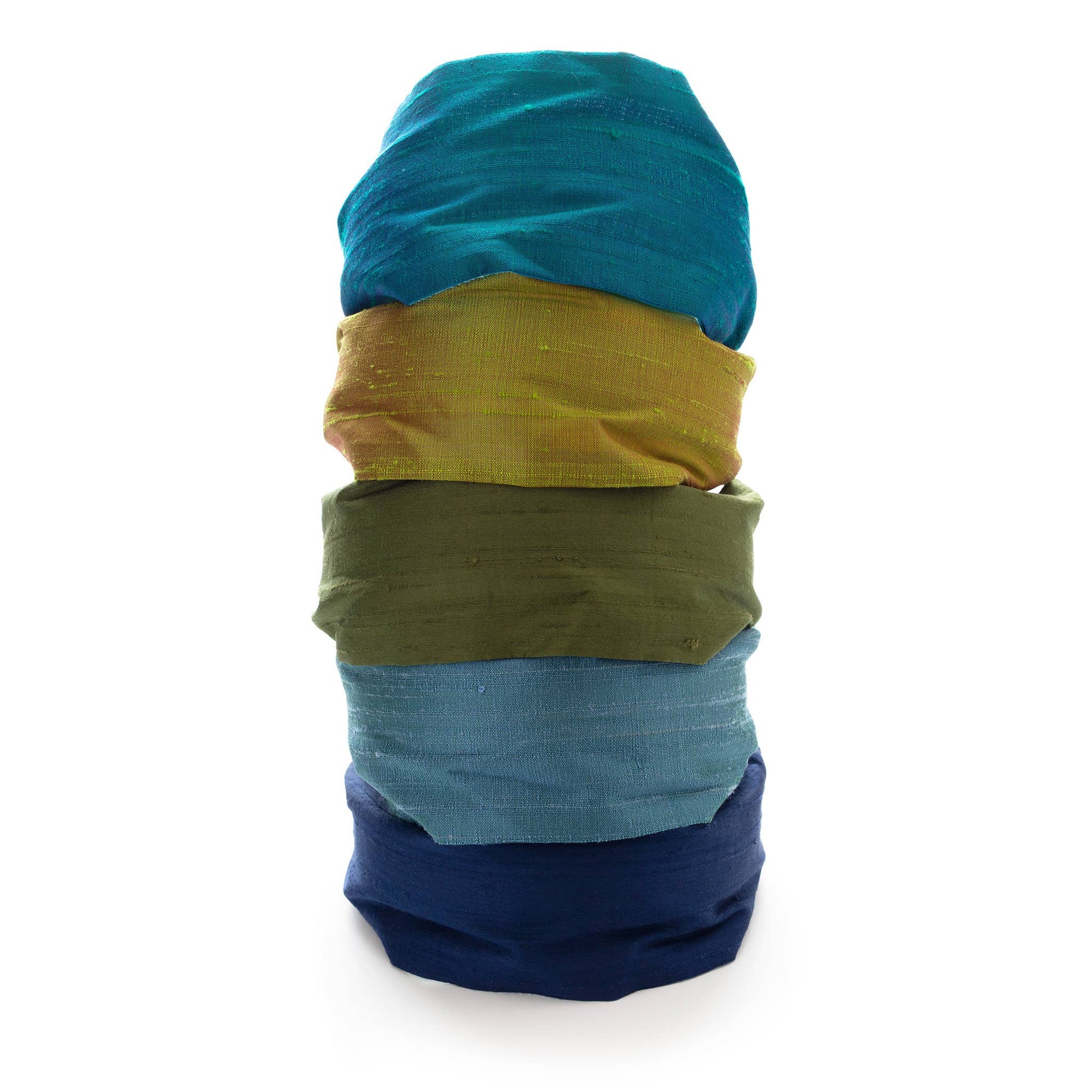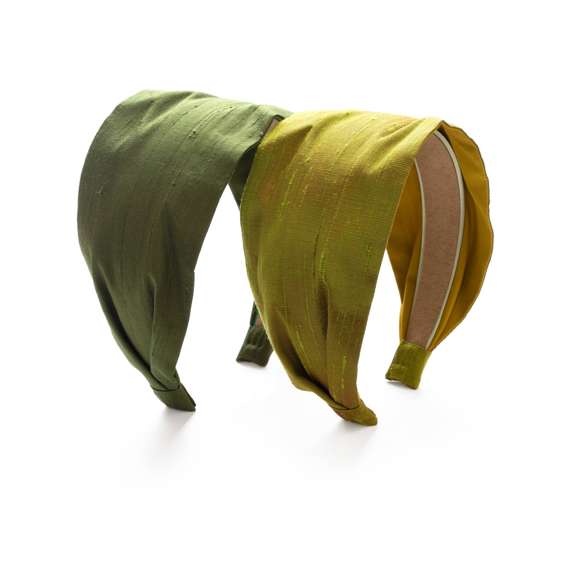The classic 3" headband measures 3" at its widest (top of head) and tapers down to 3/4" at the ends (behind the ears). From end to end the headband measures 14.5". It's tight enough for a good grip but loose enough to avoid headaches. Classic headbands have a top piece of fabric (solid silk or patterned cotton) and bottom piece of fabric (solid cotton) that are sewn together and glued on to the headband form, which is made of a pliable and soft plastic. The glue used is non-toxic and washable. The headband form is visible from the bottom side of the headband. Great for a bad hair day or to spruce up any hairdo! This stack of headbands is listed, from top to bottom as ANEMONE, SWISS CHARD, TUSCAN OLIVE, PEACOCK, NAVY.