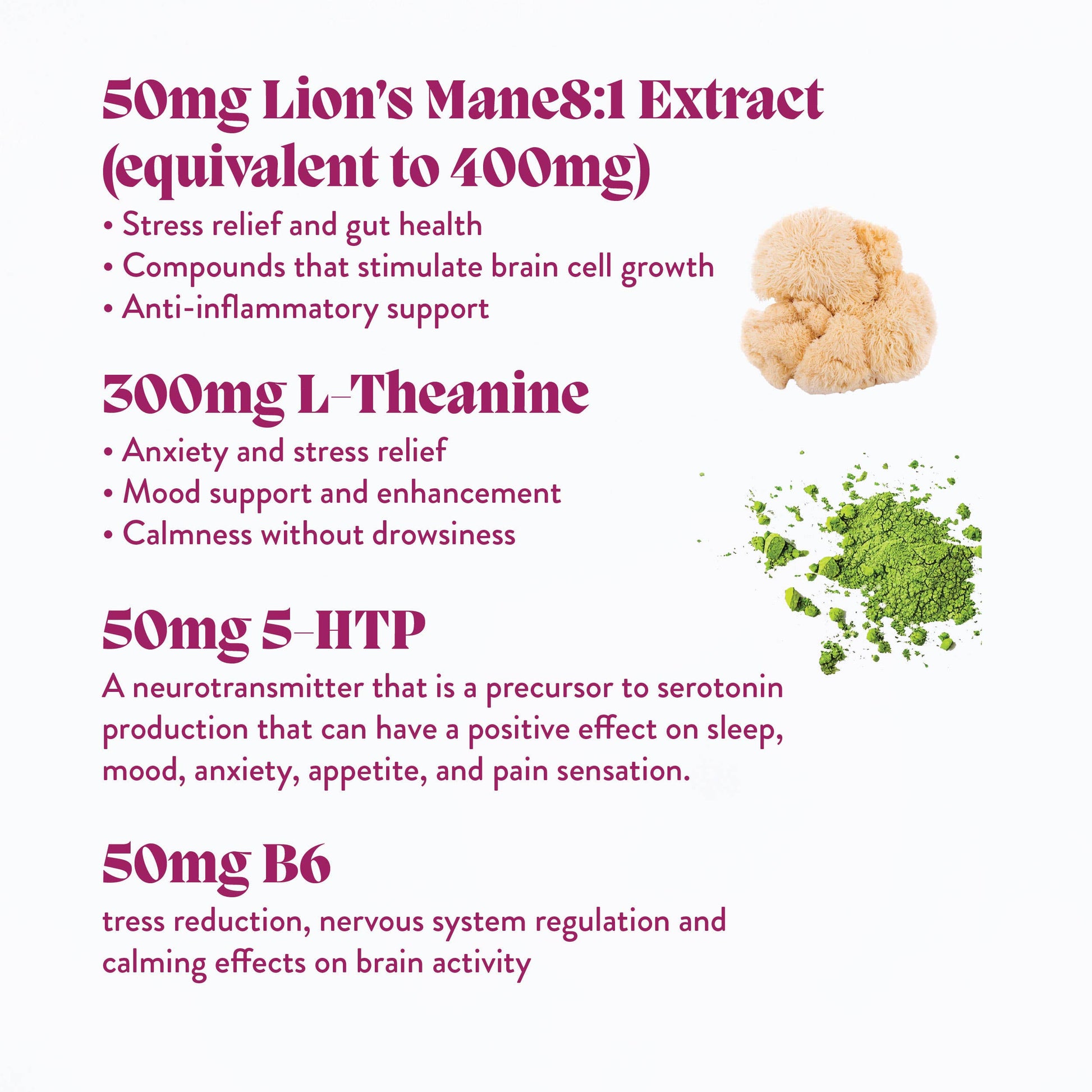 This blend of mood boosting, high potency organic Lion’s Mane mushrooms and L-Theanine combines with feel-good 5-HTP and nervous system regulating B6 to promote a clear, calm mind and a more radiant spirit.