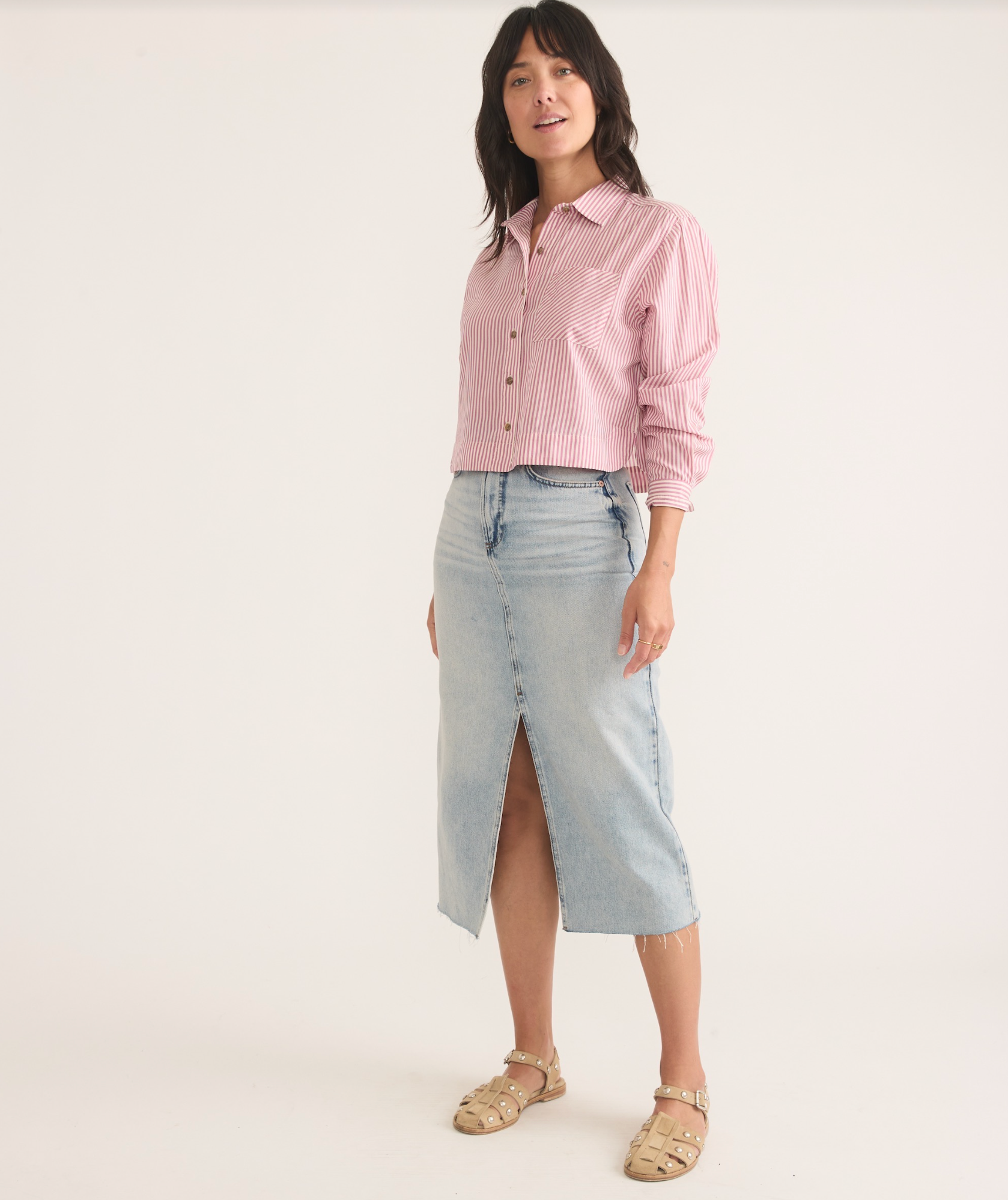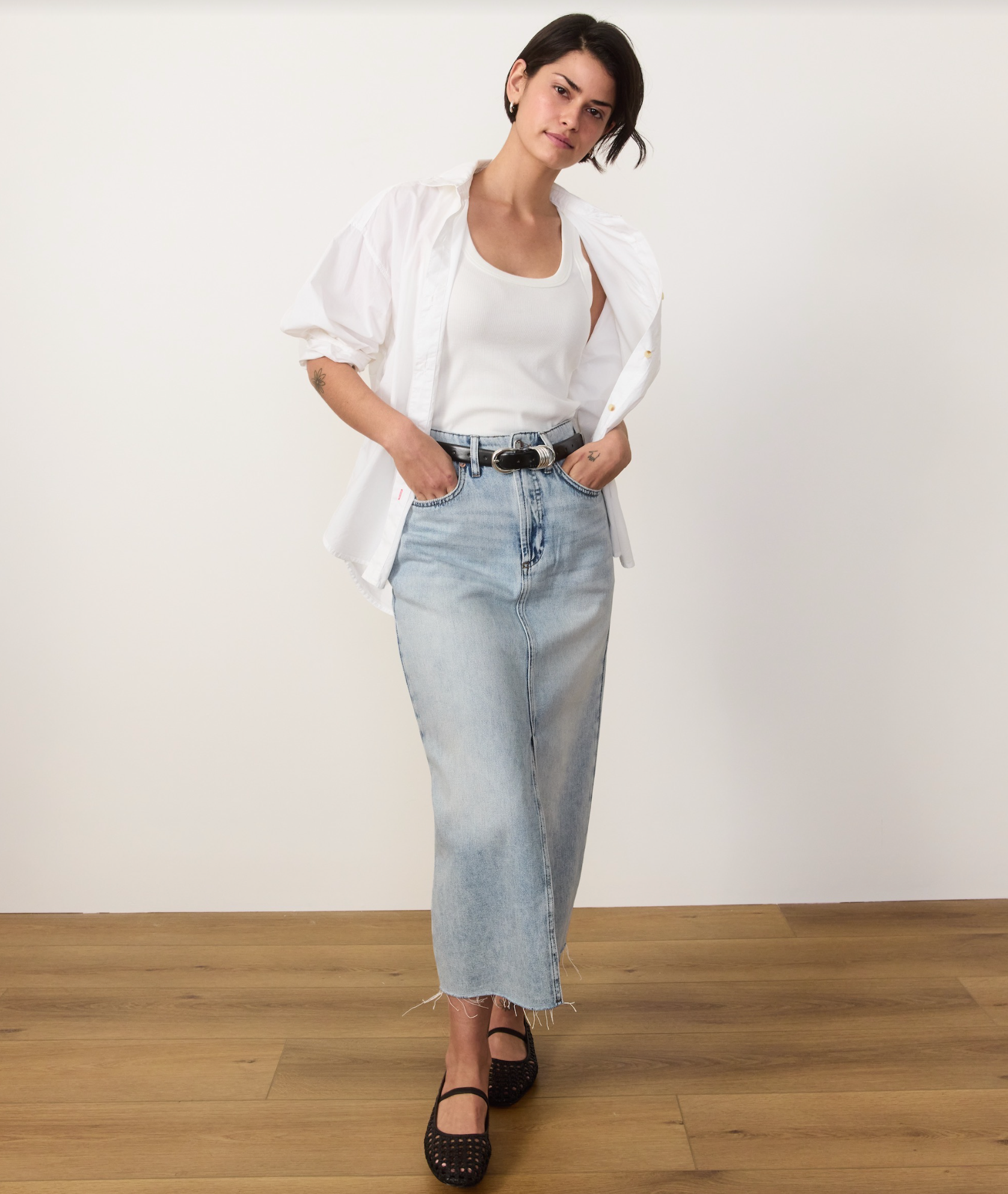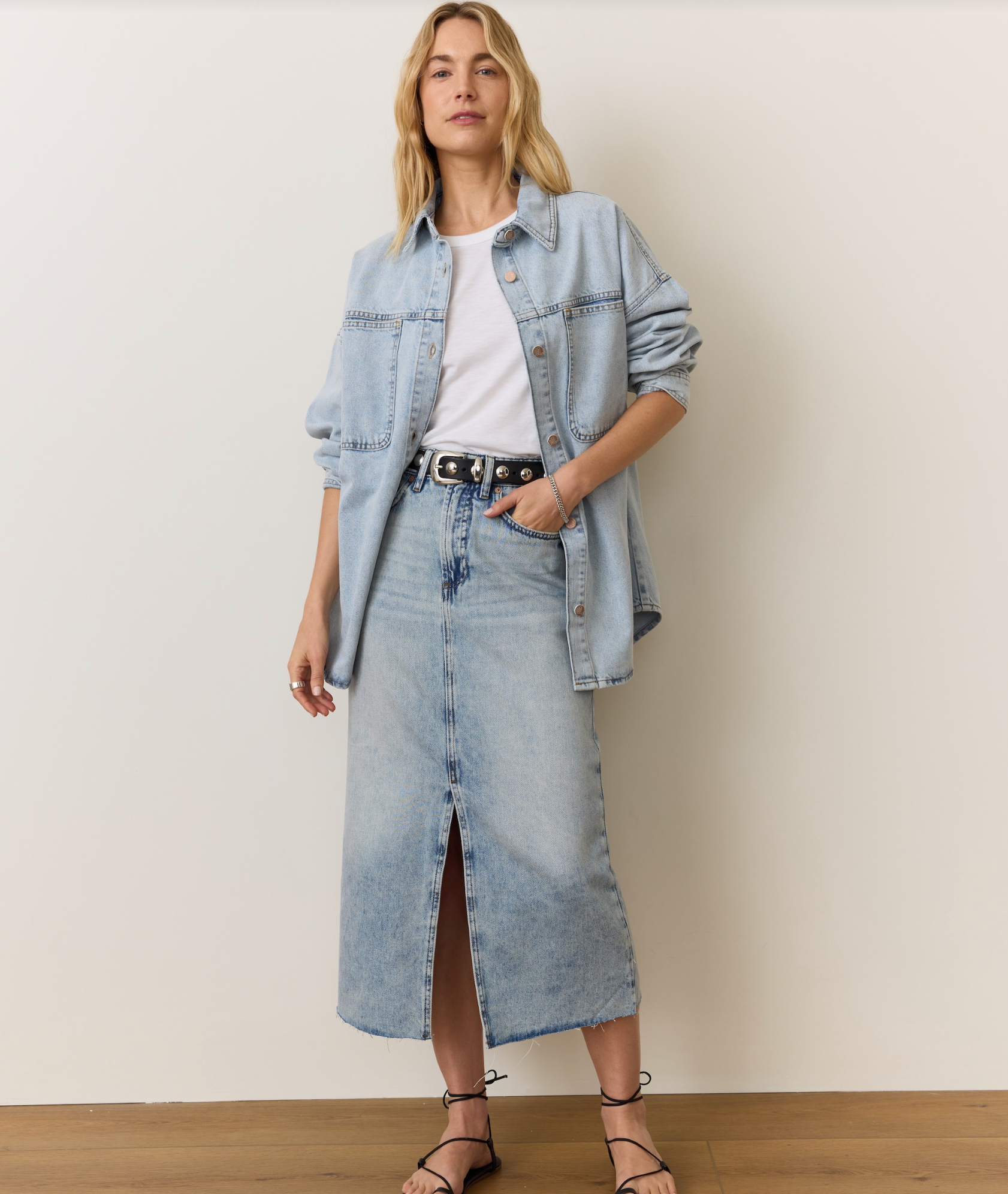 Let us introduce you to the skirt you'll want to wear with everything. This denim midi skirt features a slit at the front for easy movement, straight fit, and is fitted at the waist. It pairs perfectly with sweaters, vests, button downs, you name it.