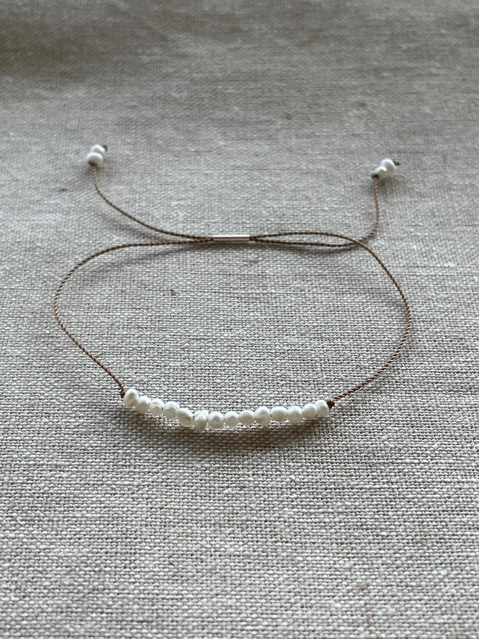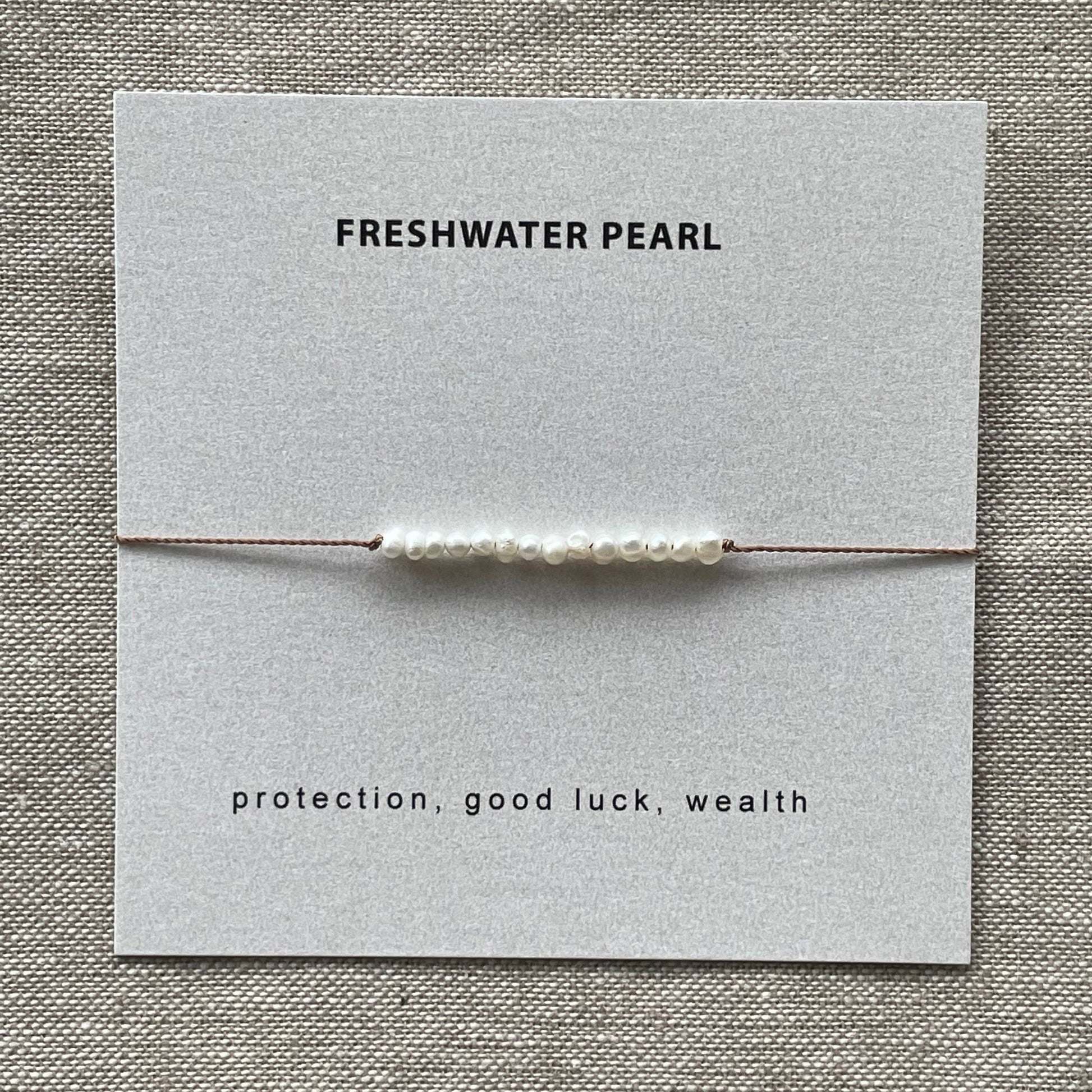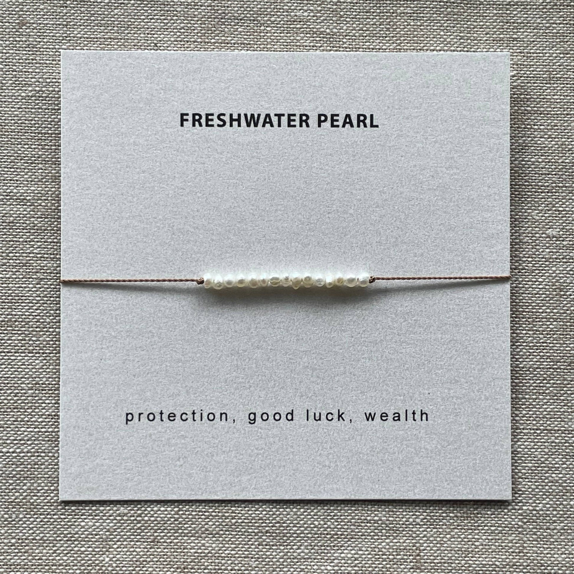 Wealth bracelet featuring tiny, freshwater pearls hand knotted on a thin, durable nylon cord for this minimalist bracelet. Bracelet is adjustable with a silver sliding bead that can be worn at any length. Bracelet is packaged on a pretty card with stone meaning ready for gifting.