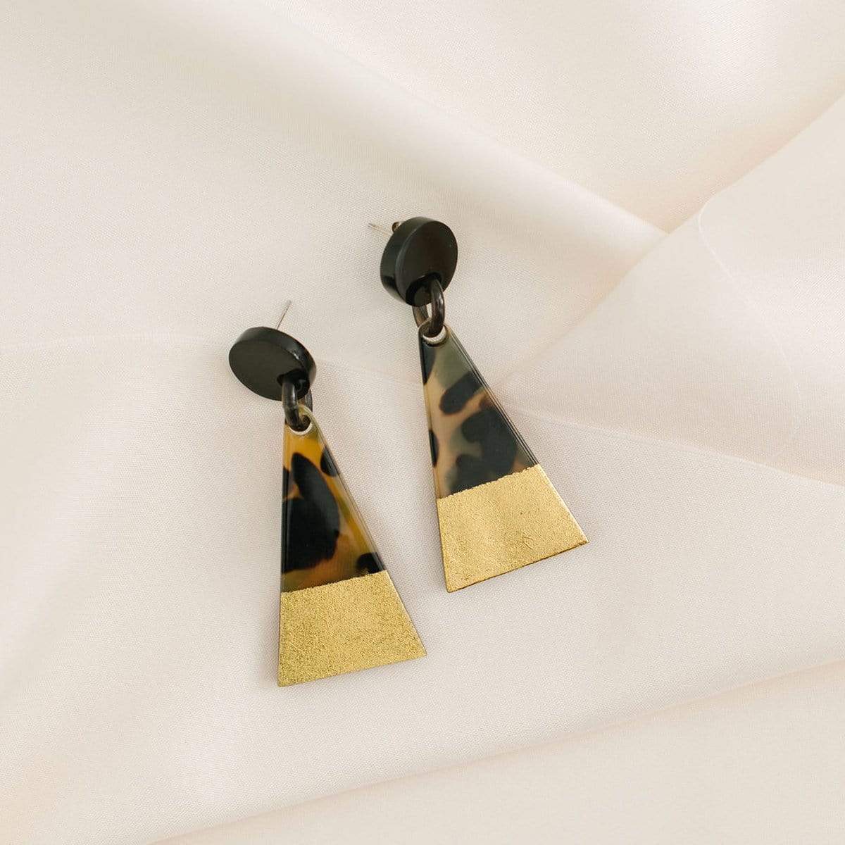 Our painted tortoise horn earrings have a gold leaf shine on the bottom that absolutely glistens when you wear them. Such a fun twist on our basic small triangle earrings.