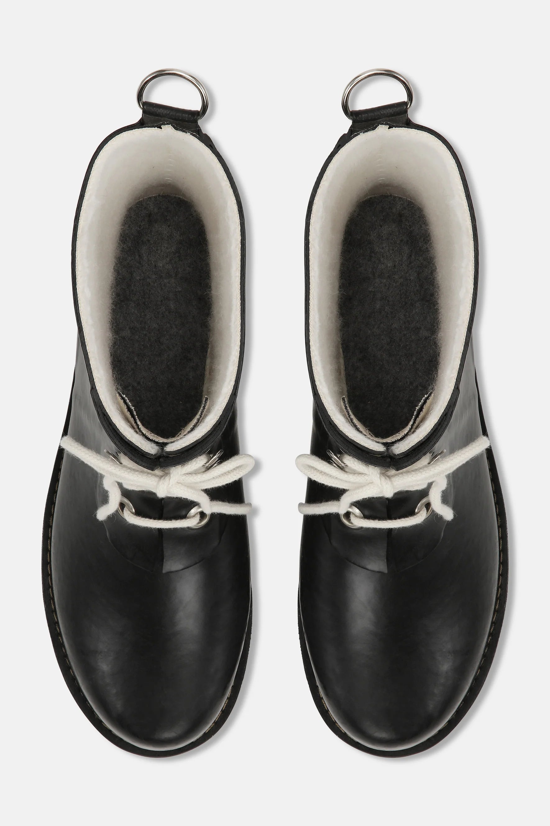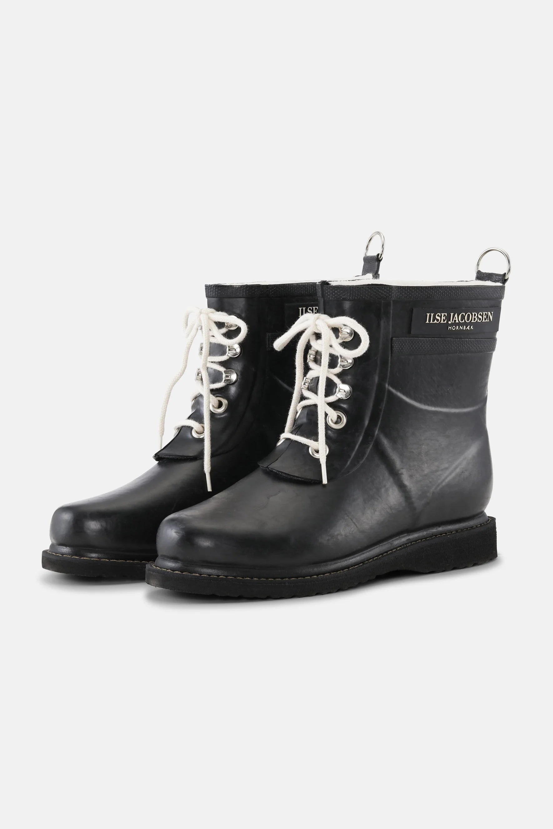 This short rubber boot from ILSE JACOBSEN HORNBÆK is a modern interpretation of the iconic rubber boot RUB01. Only shorter and lighter, but with the same unique features such as the eye-catching laces with the metal eye-lets, the decorative D-ring at the back as well as the gusset on the inside of the tie part, that prevents water from getting in.
