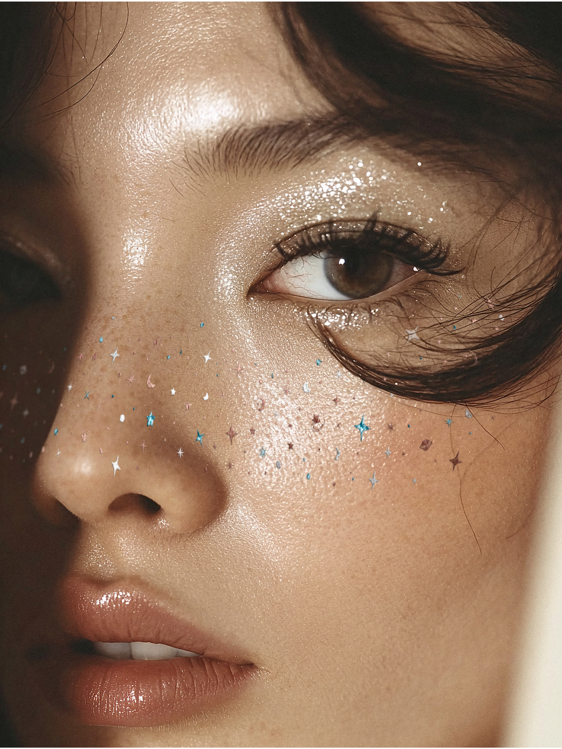 No brushes, no glue, no fallout. Just peel, press, and shine. Waterproof, sweat-proof, and made for movement, these speckles stay put for 1–3 days while keeping your glow intact from daylight to starlight. Remove easily with micellar water or an oil-based cleanser and re-apply anytime your night calls for a little cosmic energy.