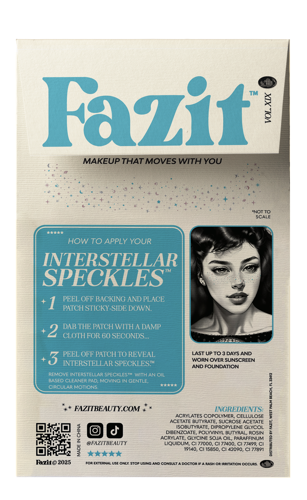 Take your sparkle to new heights with Interstellar Speckles. Our galaxy-inspired metallic freckles designed to light up any look. Each patch features a constellation of stars and moons that adhere seamlessly to the skin for celestial dimension in seconds.