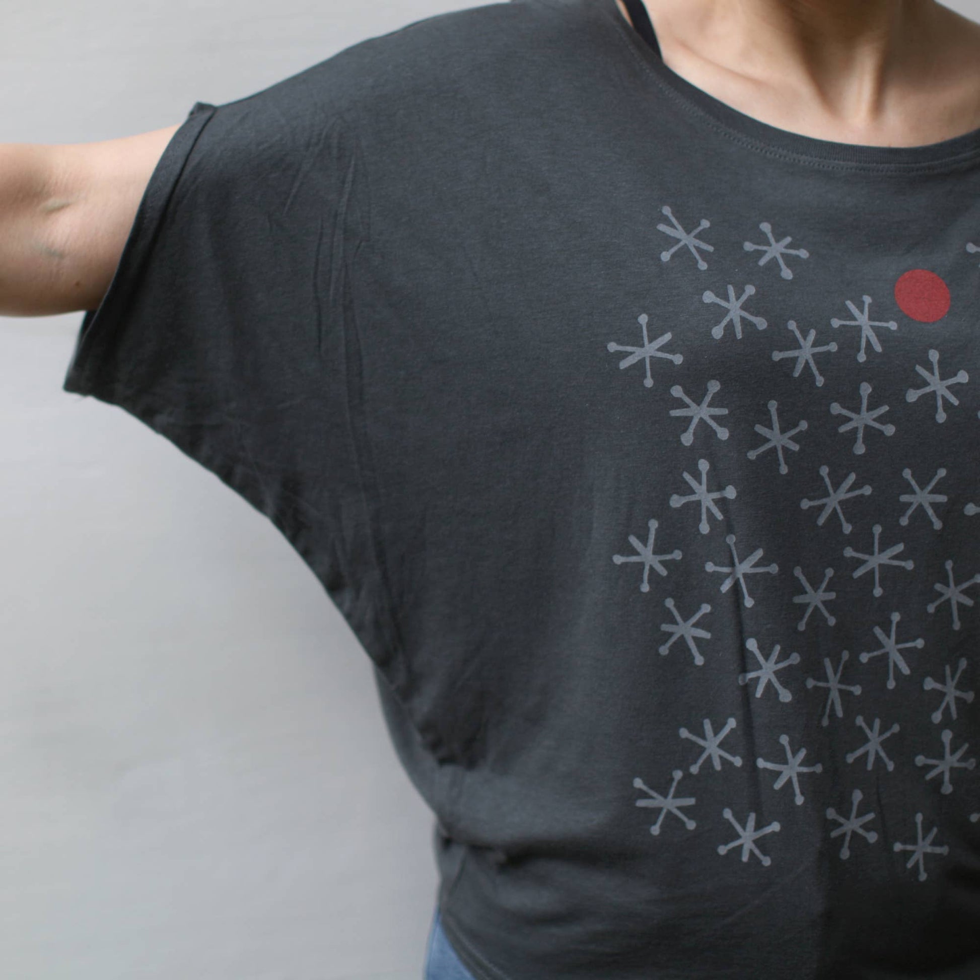 Color: pewter gray with red and pale gray ink. Made in the USA. This playful design features our mid century-themed Jacks game print. Versatile and super soft, these tops make for an everyday staple that you won't want to take off. Available in S-2XL. General sizing guidelines are as follows: