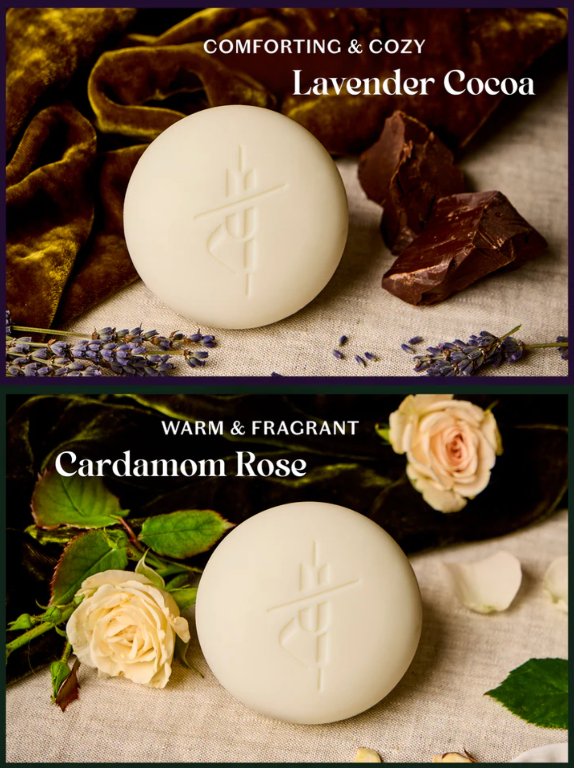 Comforting and nostalgic, this limited edition Body Stone Duo pairs velvety Lavender Cocoa with decadent Cardamom Rose. Lavender Cocoa is a floral twist on a cozy classic, inspired by winter mornings wrapped in your favorite robe. Cardamom Rose blends delicate petals with warm spice in an ode to time-honored recipes. These full-size Body Stones melt into skin to deliver deep hydration and a moment of calm amid the holiday rush.