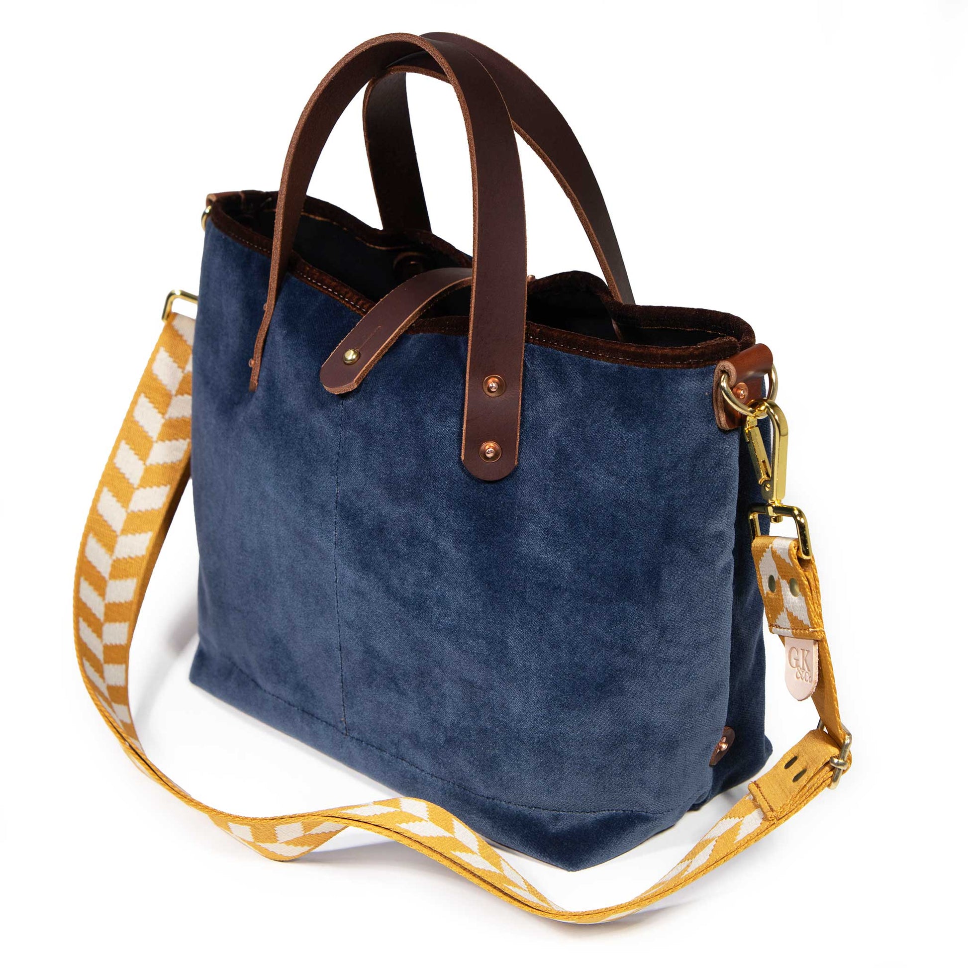Inside, a split pocket keeps phone, wallet, keys, and glasses organized, while the roomy base and shallow profile make everything easy to see and grab. Rich mahogany leather handles and a matching center strap with solid brass closure add durability and polish, reinforced with copper rivets and velvet bound seams. A water-repellent cotton canvas lining keeps belongings protected.