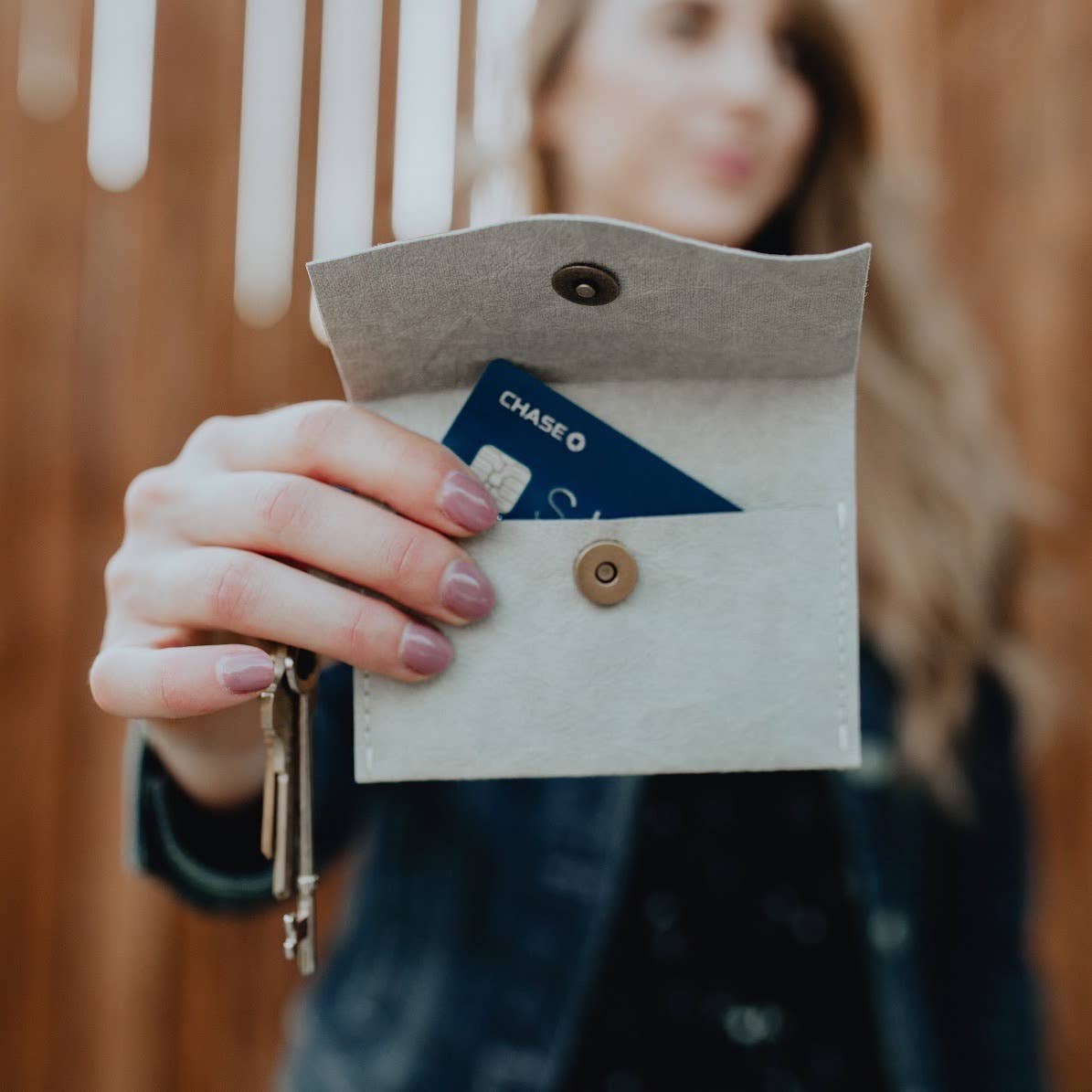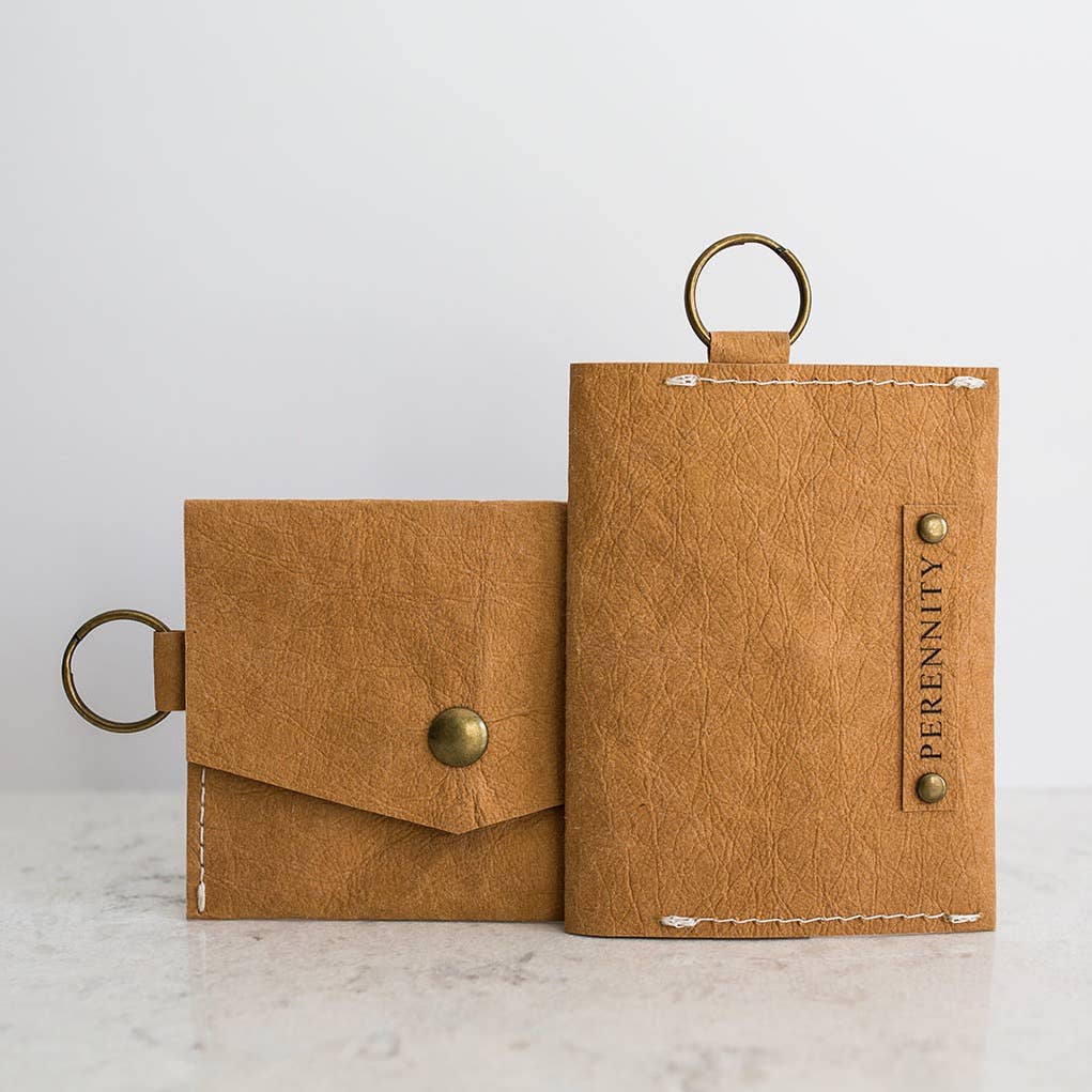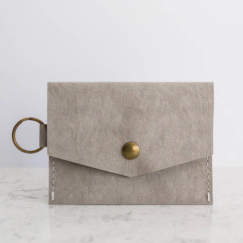 A perfectly miniature version of our envelope clutch with a keyring for added versatility! - Made of washable paper that stretches and burnishes with wear into a beautiful patina. - Antique brass magnetic snap closure and keyring. - As this is handmade of a natural material, each item can vary slightly in texture and color. - Do Good: washable paper is sustainable, recyclable, compostable & Oeko-Tex Standard 100.