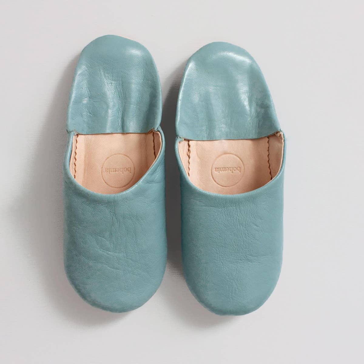 Our Moroccan Babouche Basic Slippers in Aqua are a contemporary take on a traditional design. Handcrafted by skilled leather artisans in Morocco, these bestselling soft leather slippers are cosy, lightweight and effortlessly slip on and off; the perfect house shoes. gift idea for those who value slow fashion and traditional craftsmanship. Curate your own babouche slipper collection from our wide range of colours and styles for your customers this spring and summer. • Ethically Handmade in Morocco • Leather • For indoor use only
