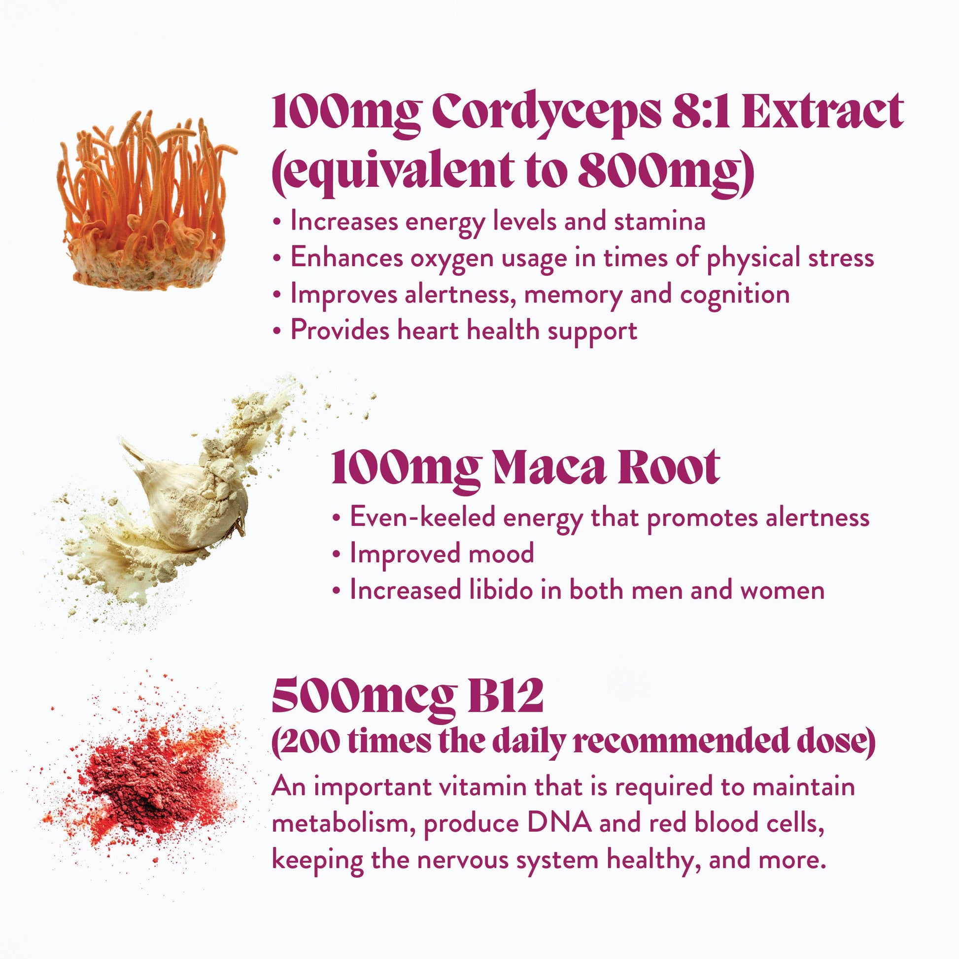 This blend of energy boosting high potency, organic Cordyceps mushrooms, organic plant food Maca Root for alertness and B12 for an additional kick of wakefulness, will make for brighter days.