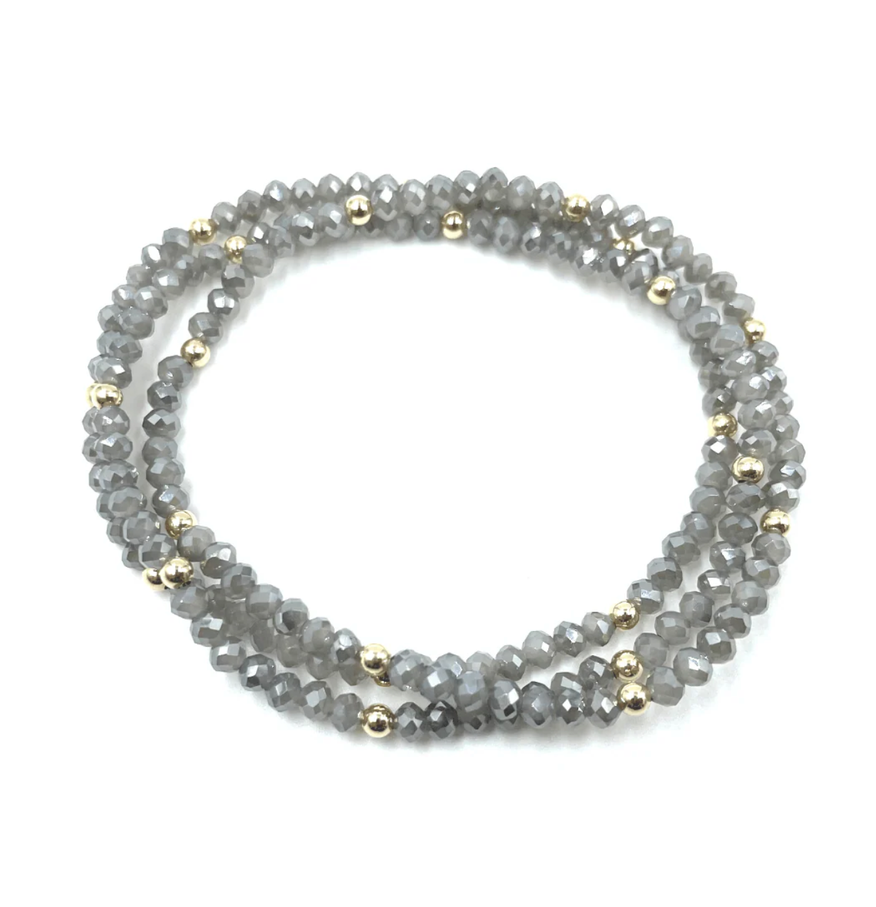 Our erin gray original (OG) classic shimmer 3-stack bracelets in light gray sparkle, dotted with 14k gold-filled 3mm beads. A classic favorite that stacks well with others. 7 inch stretch bracelets.