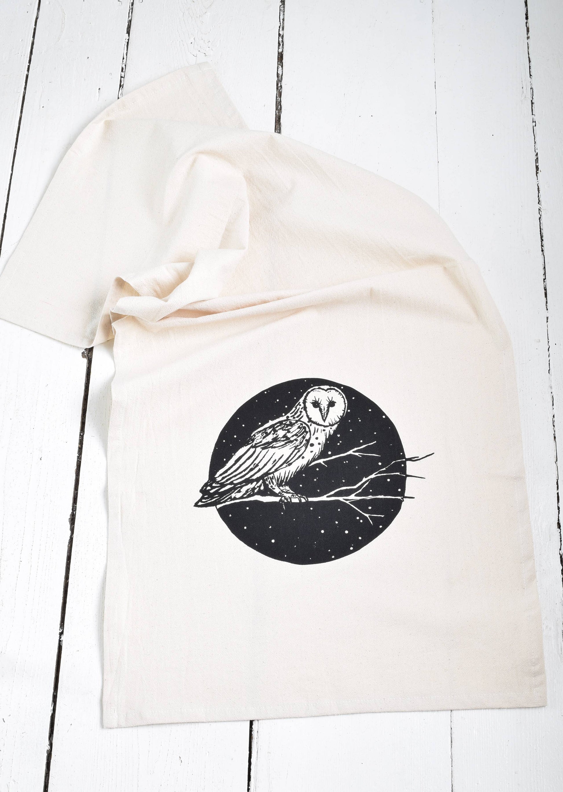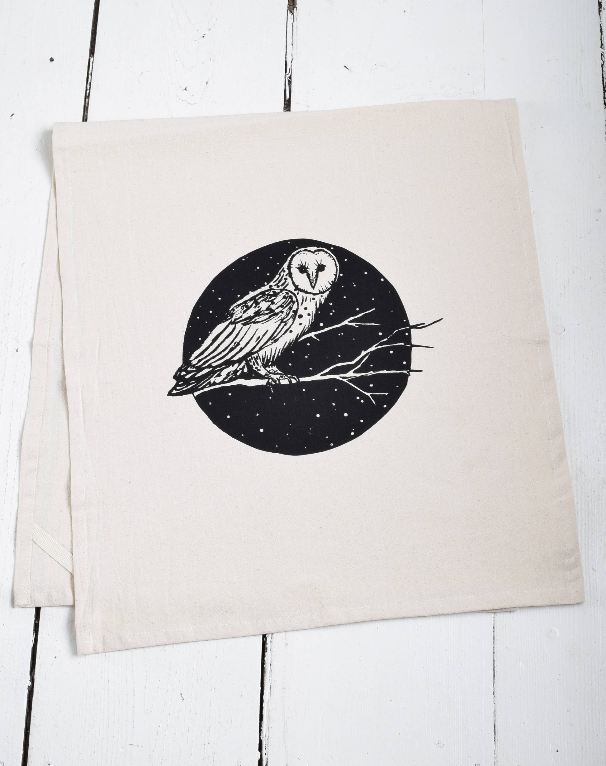 Organic Cotton Barn Owl Tea Towel - Black Print - Bird Kitch