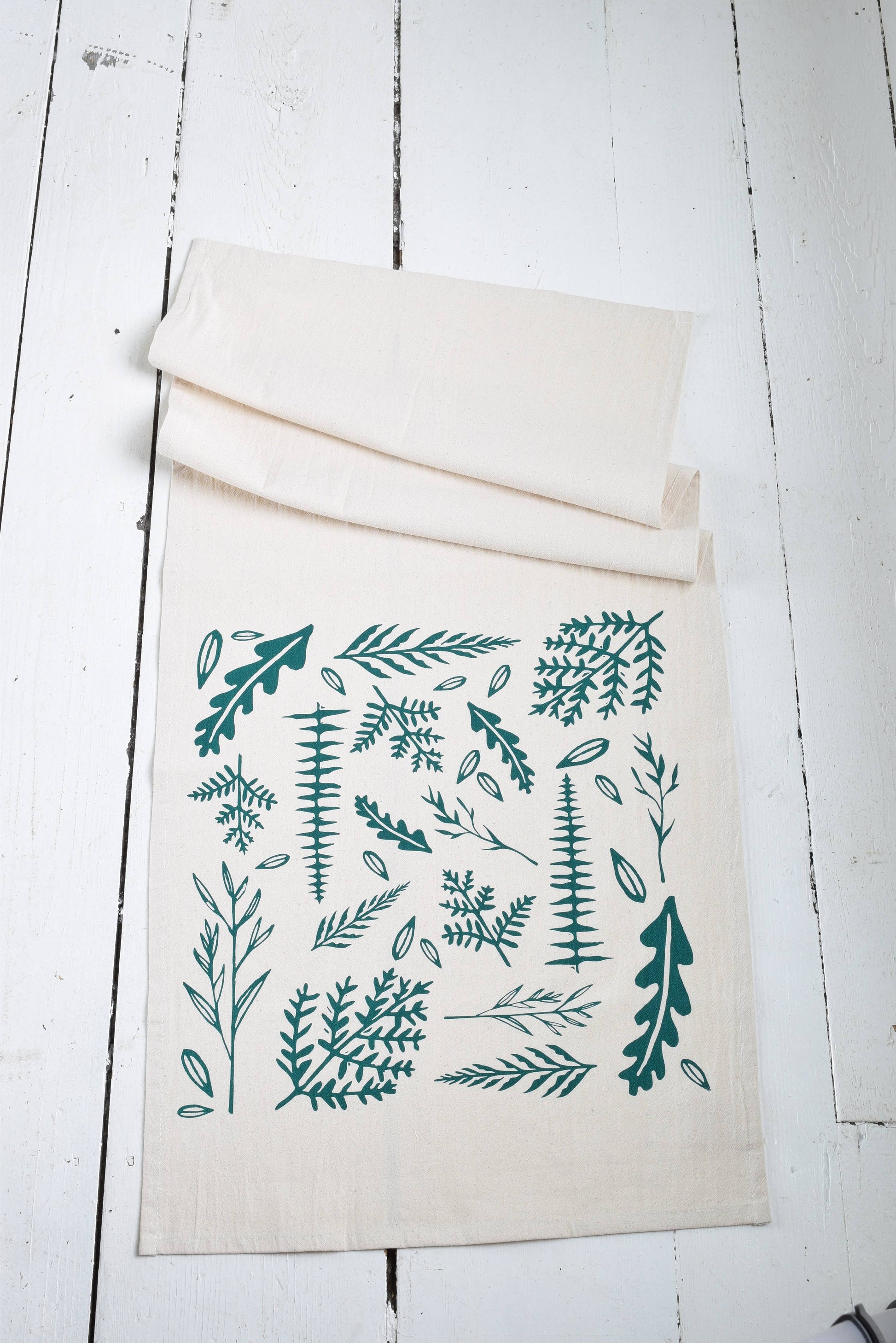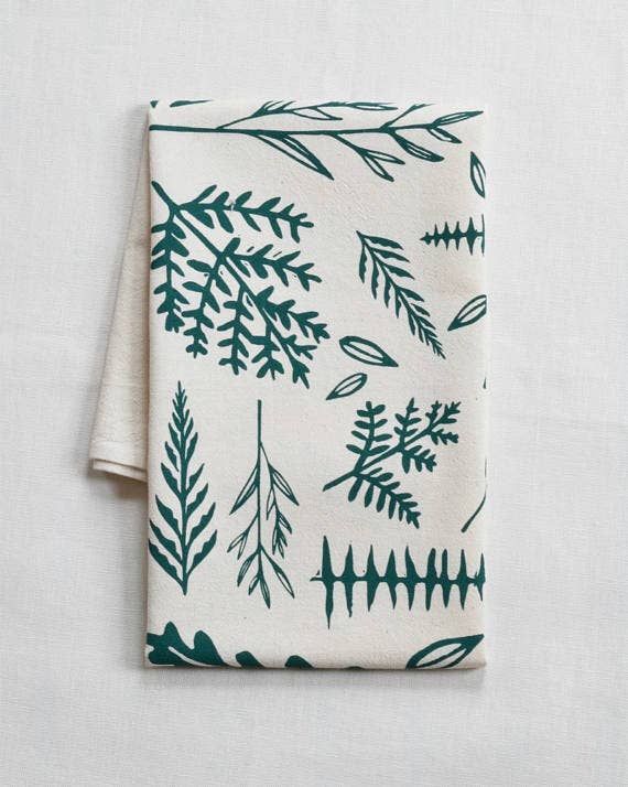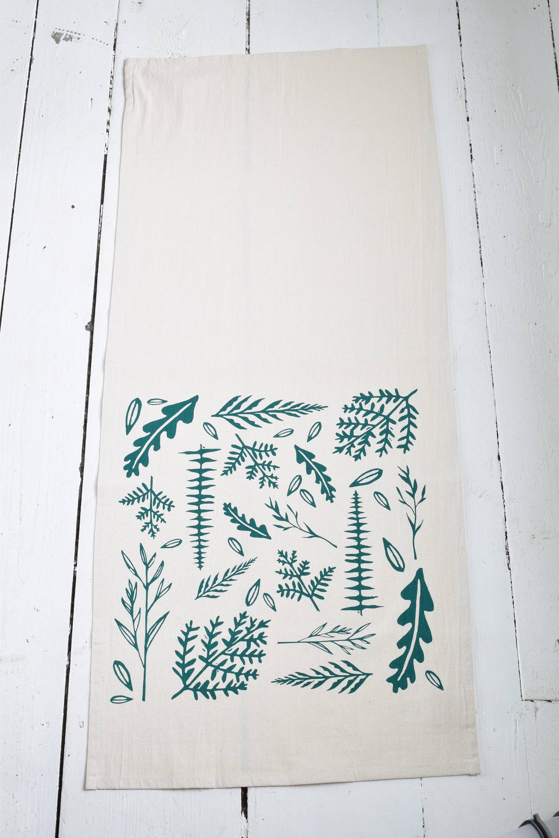 One large organic cotton tea towel (17" x 38") screen printed with my original Woodland Ferns design in dark green. These are designed by me and hand-printed using eco-friendly ink. Each towel has an organic tag and twill hanging loop. These are each printed on the bottom half of the extra long towel, perfect for folding in half and hanging.
