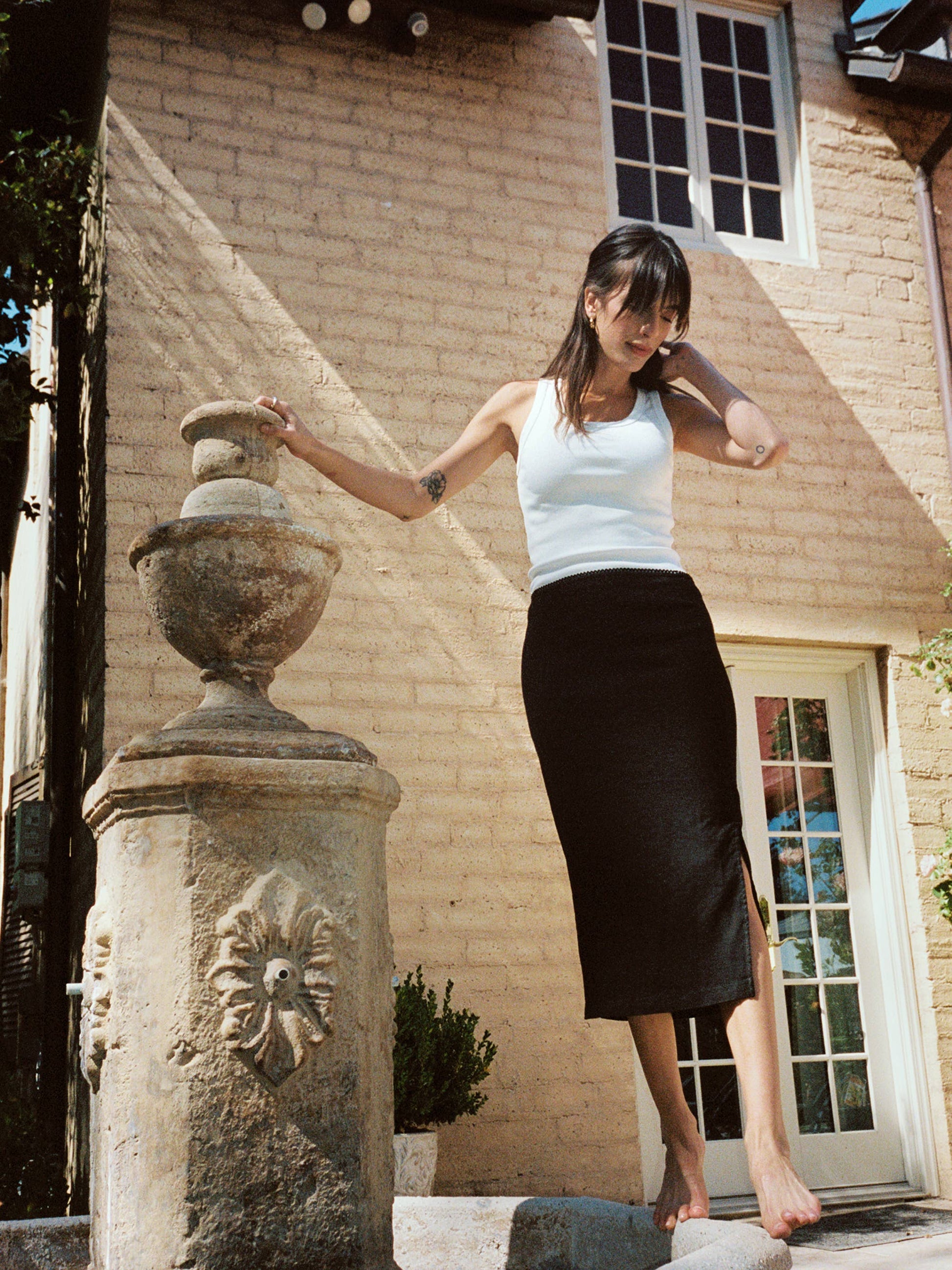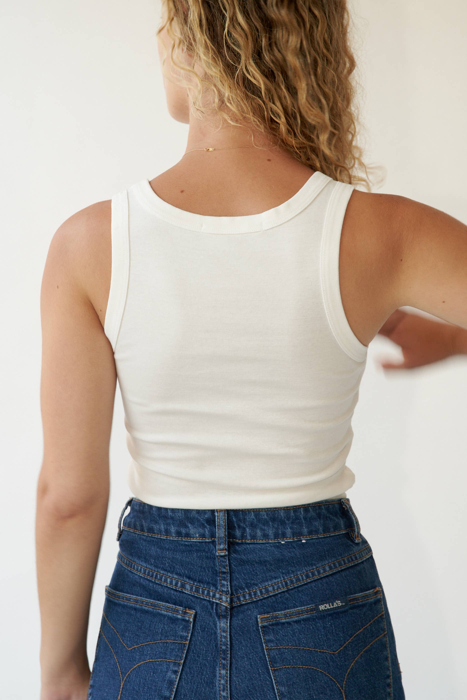 This classic rib tank features a scoop neck and wide binding. Slim fit makes it great for layering and tucking. The baby rib offers easy stretch and exceptional recovery.