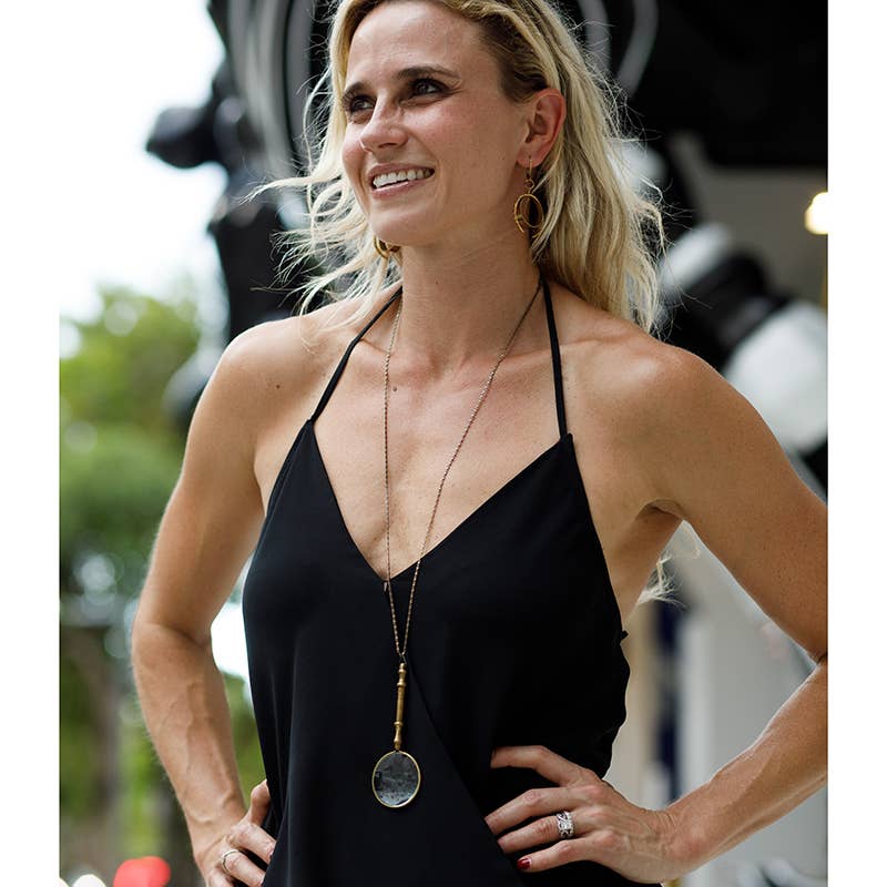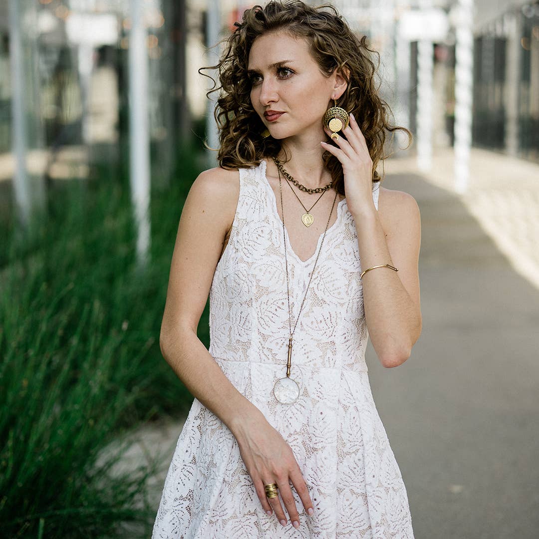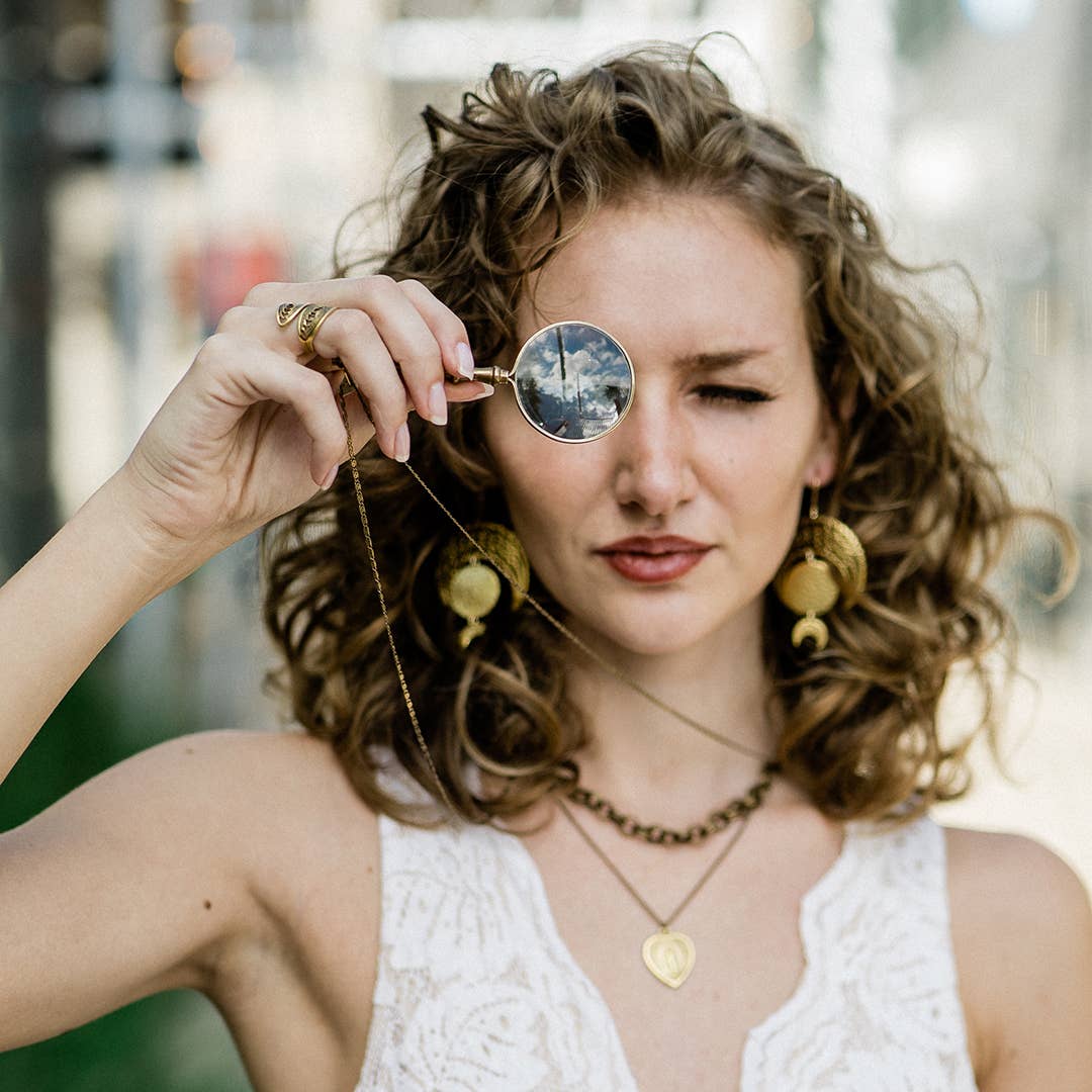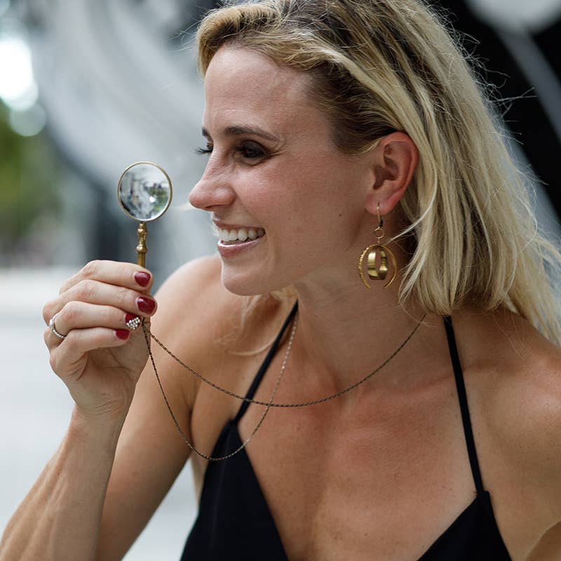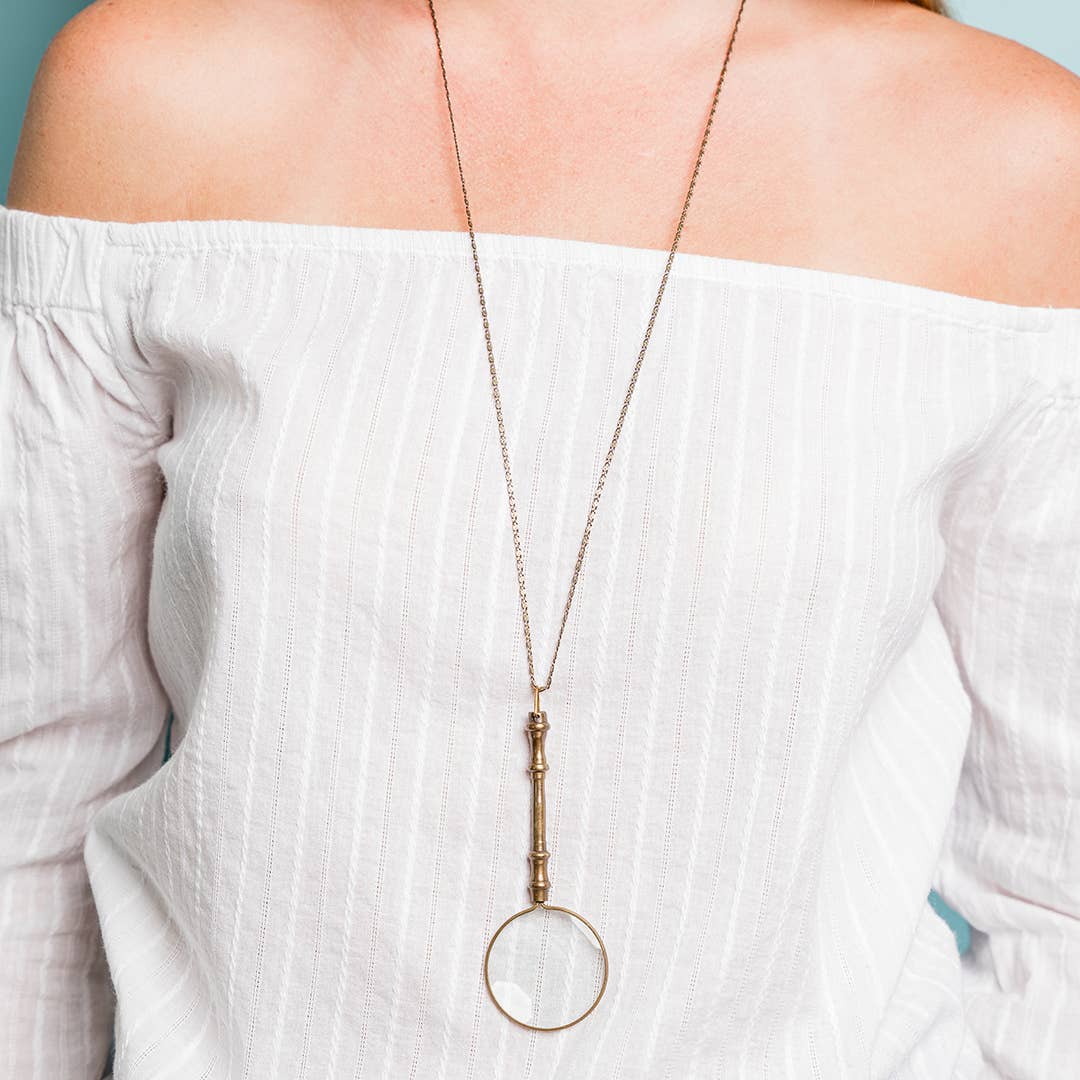 Magnifying glass with ornate handle on aged brass scroll chain.