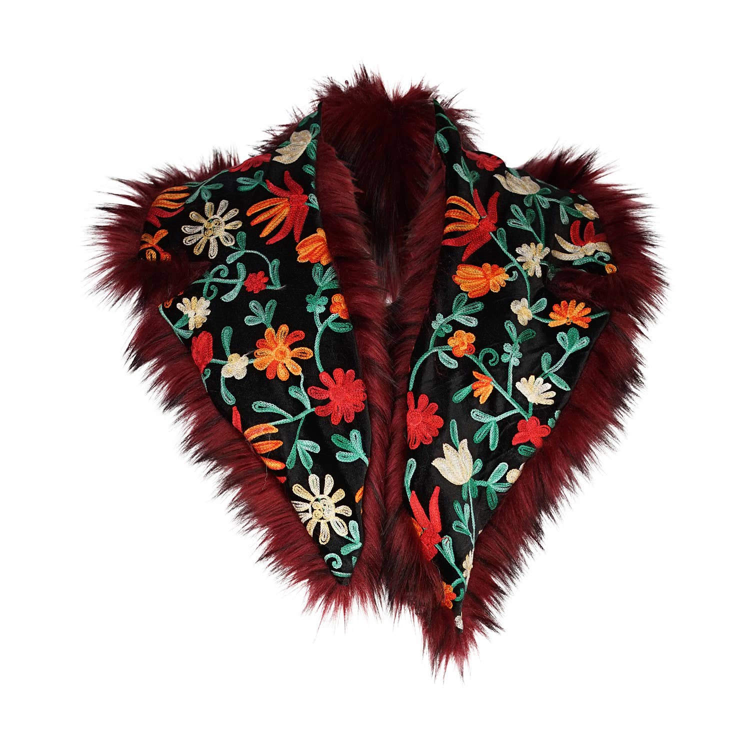 This luscious oxblood and black tipped faux fur collar is the perfect accessory to "Penny Lane" your look. Made with a super sweet embroidered lining and lots of love! Machine wash cold, gentle cycle, and lay flat to dry. Approximately 24" long from center back to tip; 6" wide.