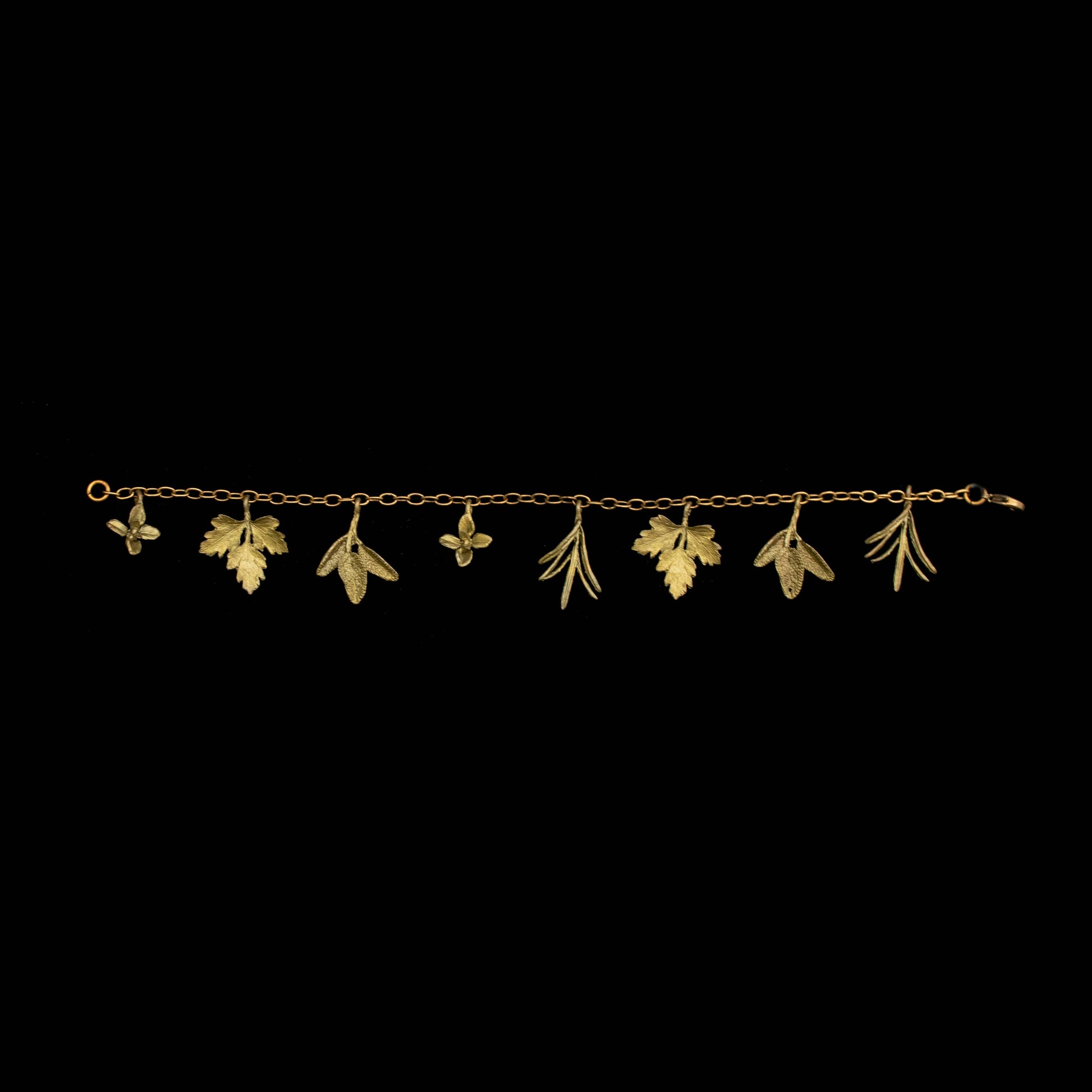 Introducing the Petite Herb Charm Bracelet from Michael Michaud, an embodiment of botanical beauty and exquisite detail. This piece captures the essence of nature using a soft patina finish on bronze, highlighting the true-to-nature design. Inspired by the natural world, the bracelet is a product of a unique casting process that starts with actual botanical elements. Its intricate detailing and superior craftsmanship make it an exceptional addition to any jewelry collection. A true testament to the beauty of nature, this bronze charm bracelet is more than an accessory, it's a wearable piece of art.