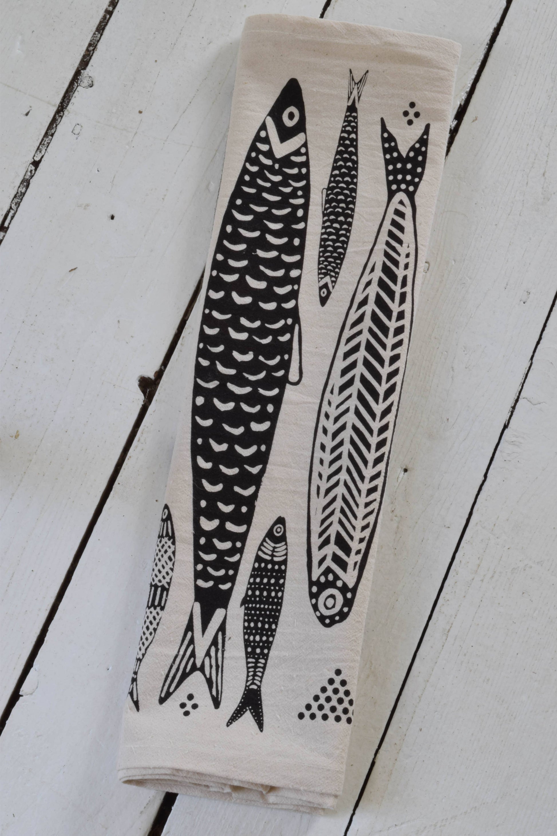 Sardines Tea Towel in Black - Organic Cotton - Fish Print