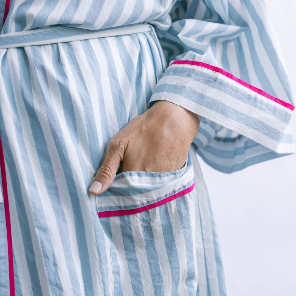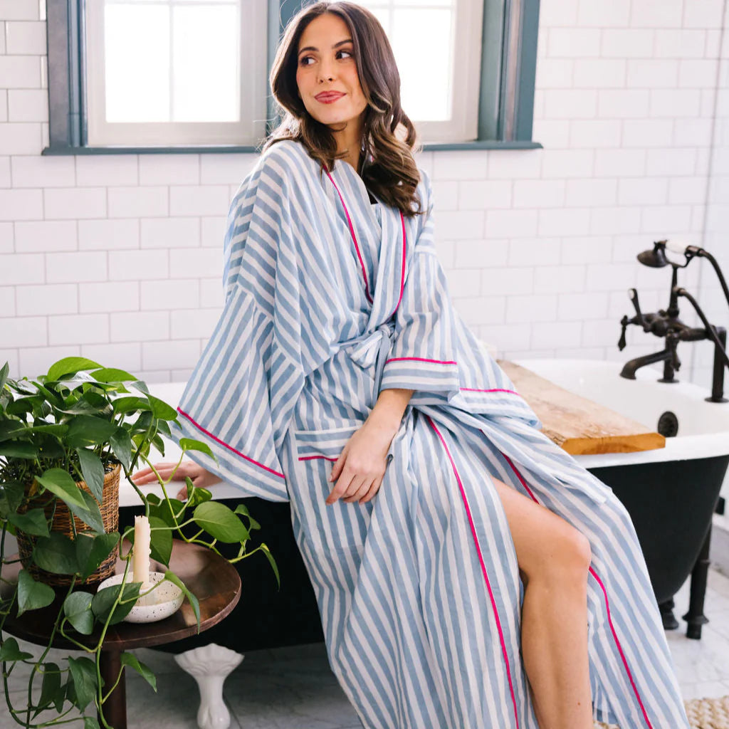 The Soft Sky Lola Robe offers a serene and stylish touch to your loungewear. With soft blue and white stripes, accented by a pop of magenta trim, this lightweight and extra roomy robe features a removable belt and wide sleeves for a relaxed fit. Perfect for lounging or as a chic cover-up, it combines comfort with understated elegance.
