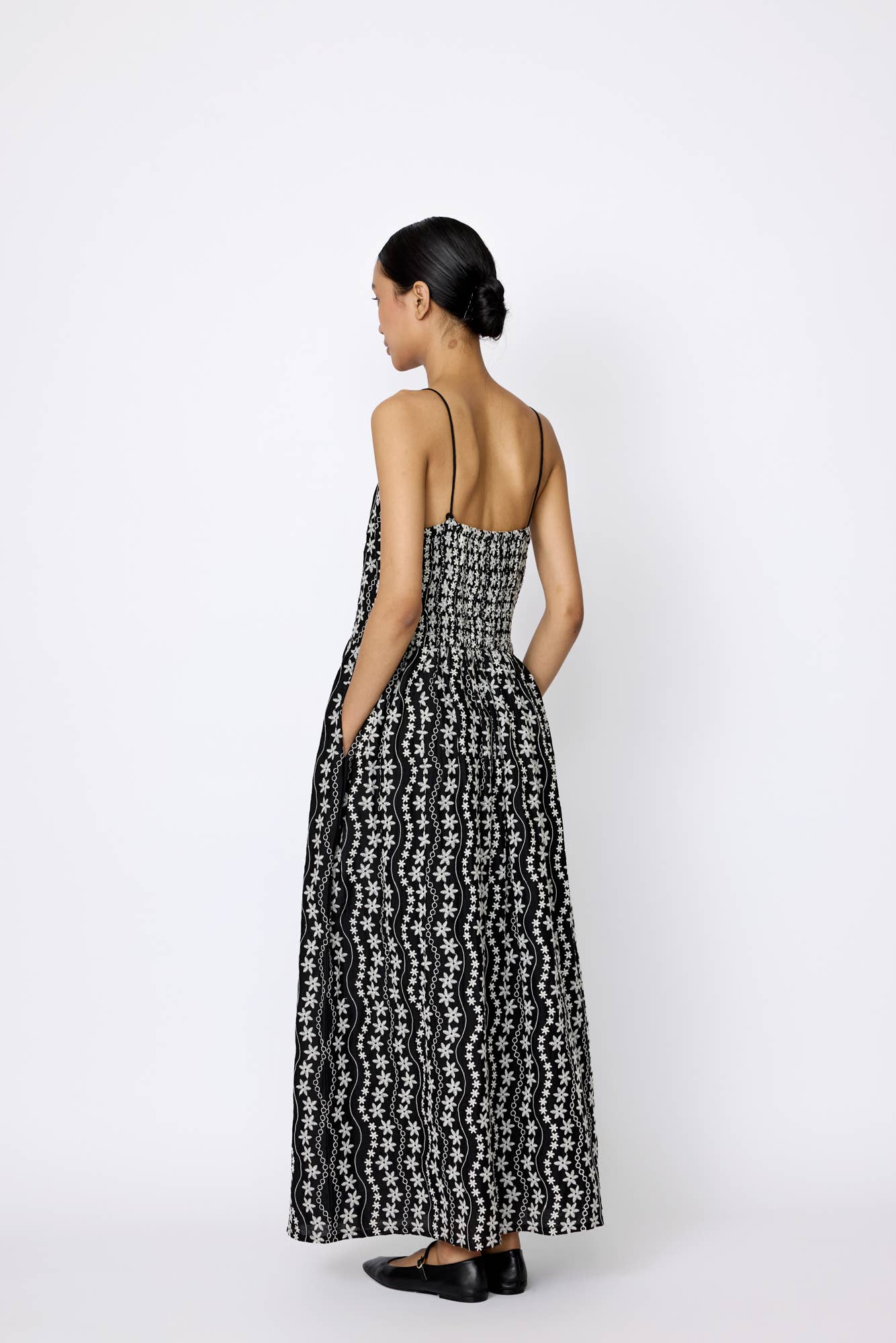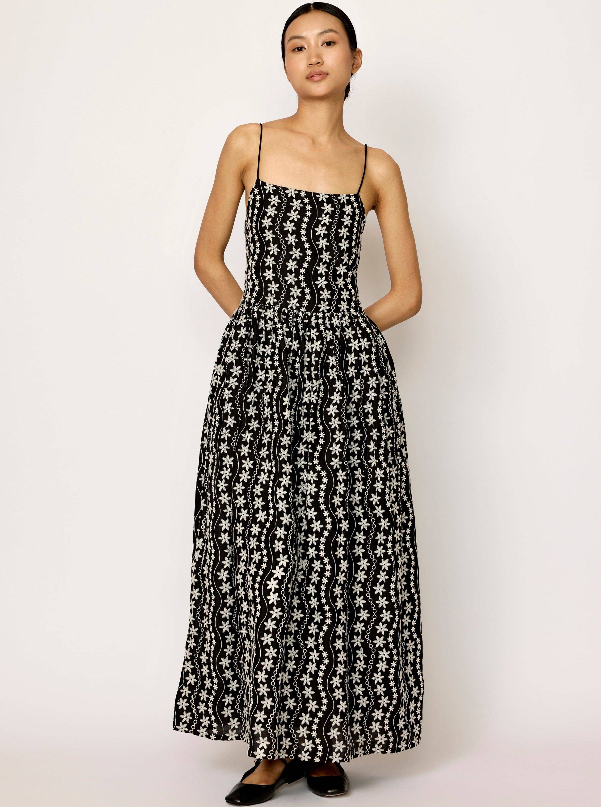 Embrace effortless elegance with our Stappy Bodice dress, designed for ease and style. Featuring delicate shoulder straps and intricate double elastic shirring throughout the back bodice, this dress ensures a flattering and comfortable fit. Crafted from a cotton/silk blend, this mid-length dress includes a self-lined bodice and practical side pockets, combining sophistication with functionality.