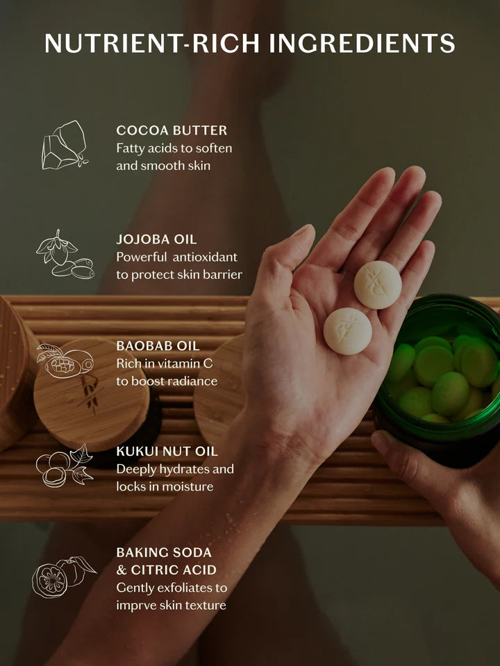 Water Activated Moisture: Single-use solid format activates with warm water, delicately foaming to release a nutrient-rich blend of cocoa butter, luxurious plant-based oils, and natural exfoliants.