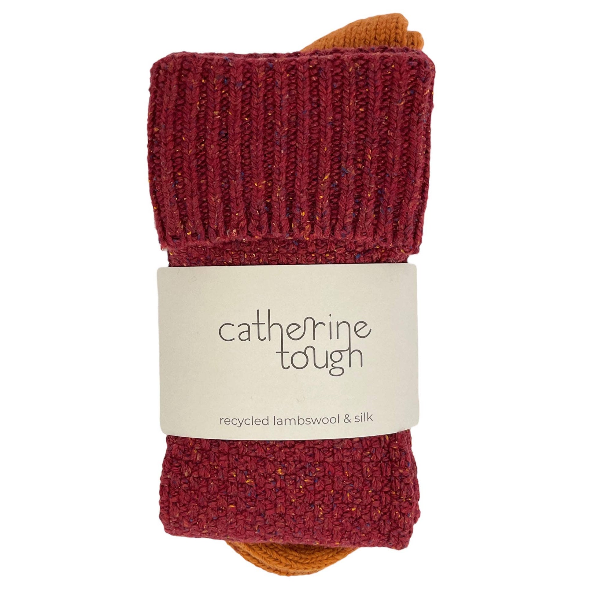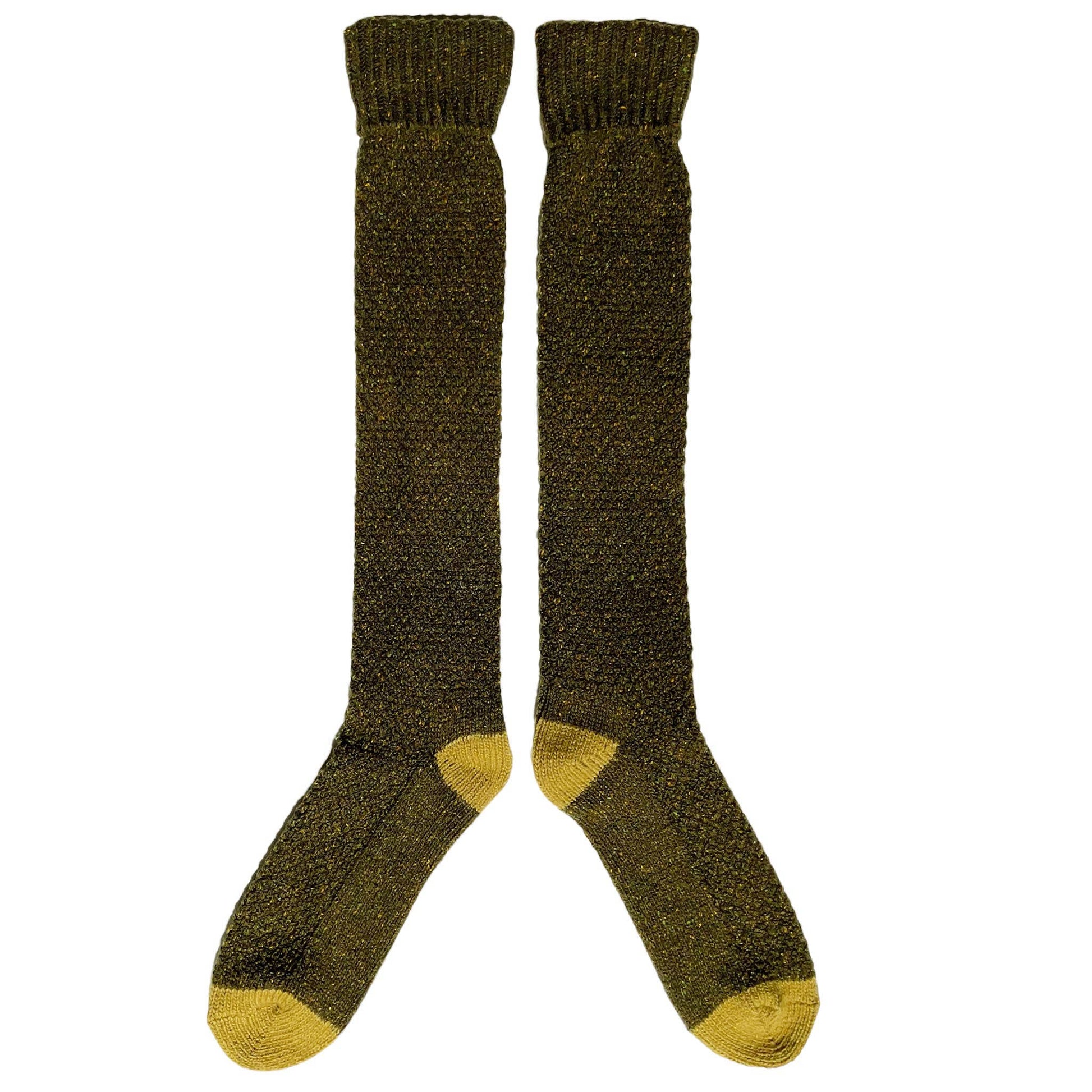 These cosy, thick, recycled lambswool & silk blend socks are ideal for lounging at home but can also be worn in boots. Textured knit with a ribbed top