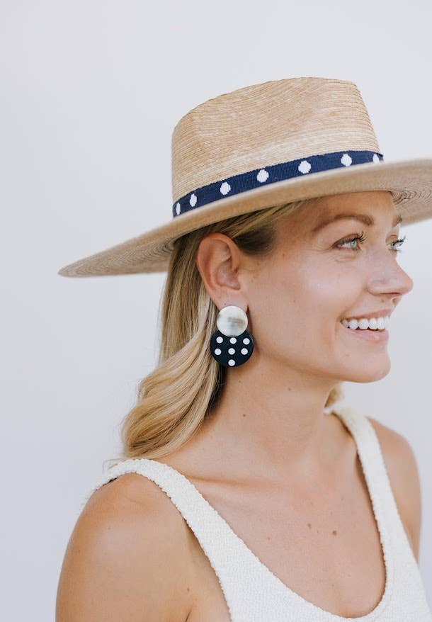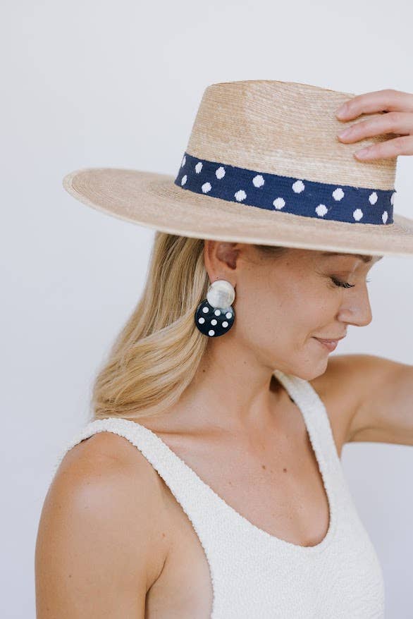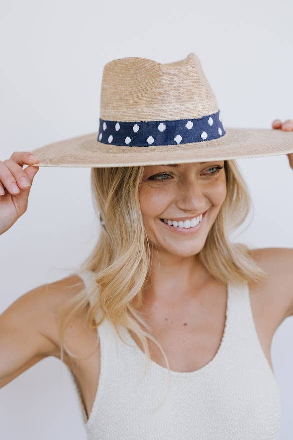 The Wendy Palm Hat features a navy, cotton woven band with white polka dots. Each one is handmade from palm fronds of the banks of the Chixoy River by our Guatemala female artisans.