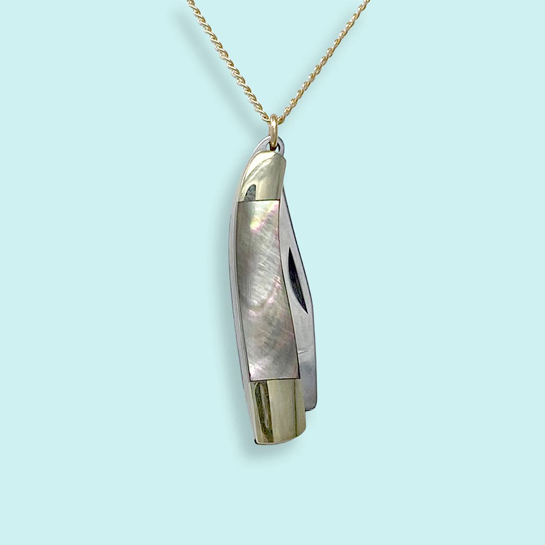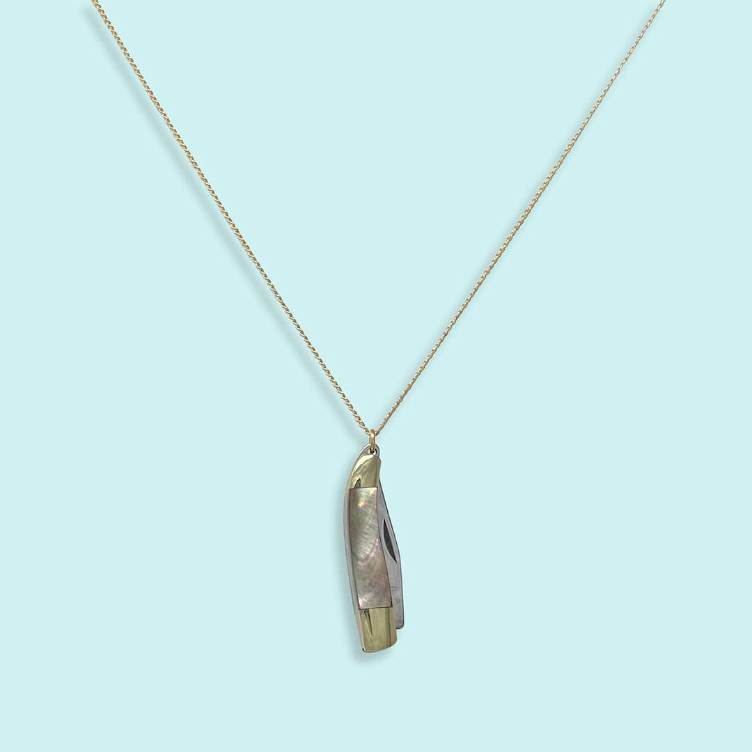 A slender, curved abalone handled knife with a semi sharp blade on a gold curb chain. Metal: Stainless steel knife, 14kt gold-filled chain Size: 1.25"L knife Lobster Clasp Material: Abalone Available in 16", 18", and 20" chain (18" Fits Most) Natural materials will vary Chain is made in the USA, Knife is made in China Keep dry Word to the wise: This is a real knife and the blade is sharp. Don't wear it with the knife open. Keep it out of reach of children. Use caution when opening and closing it (if you've never opened a pocket knife, please take a minute to find a YouTube video to learn).