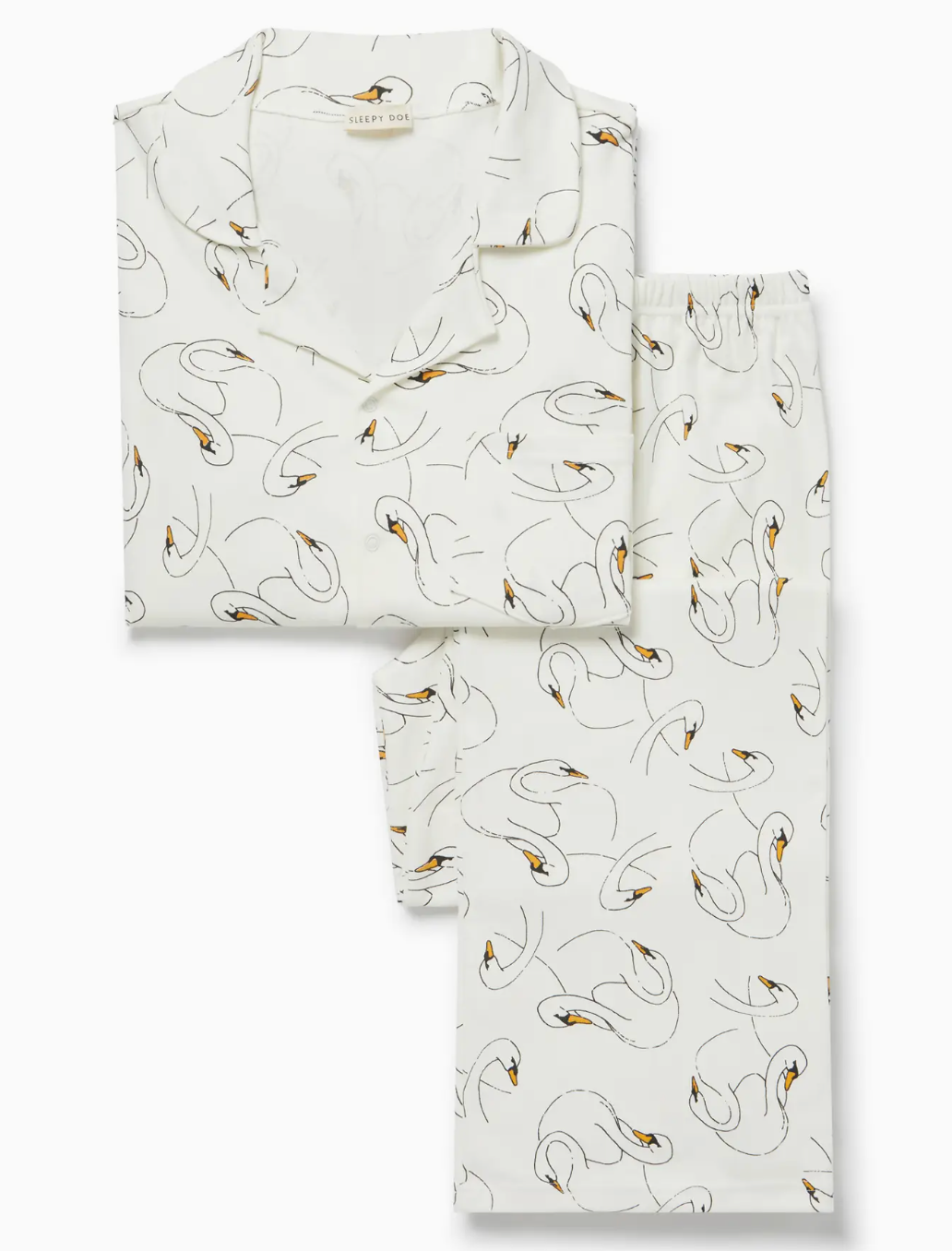 "Like sleeping in your favourite t-shirt." Sleepy Doe's softest women's shirt and wide leg PJ in Swansy. This long sleeved set has a blouse with popper opening and a comfortable baggy trouser with elastic waist and no side seam for maximum comfort. Our styling preference is to size up, they are designed to feel like sleeping your favourite oversized t-shirt. 100% organic cotton, a very soft interlock fabric for maximum night-time comfort. Sizing & care S: U.K. size 8 M: U.K. size 10-12 L: U.K. size 12-14 XL: U.K. size 16 Model wears a size small (pre-wash). The trouser is designed to sit on your ankle once washed to avoid tripping. Save energy wash on 30 and hang to dry, please do not tumble dry. The sleepwear should have no more than a 5% shrinkage after a couple of washes. Knitted ethically and printed in the U.K. using water based ink. Sleepy Doe's sleepwear is proudly designed and made in Britain supporting independent suppliers and factories.