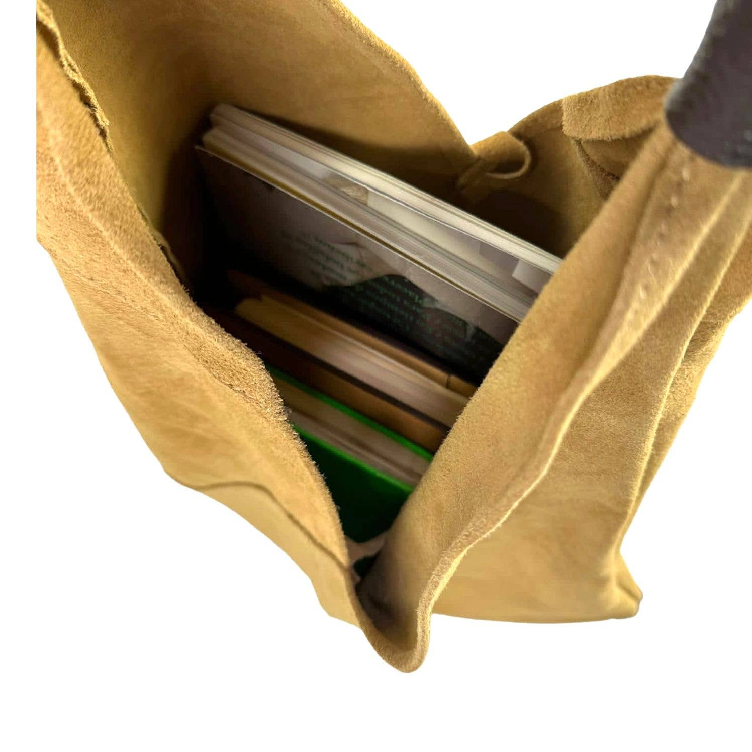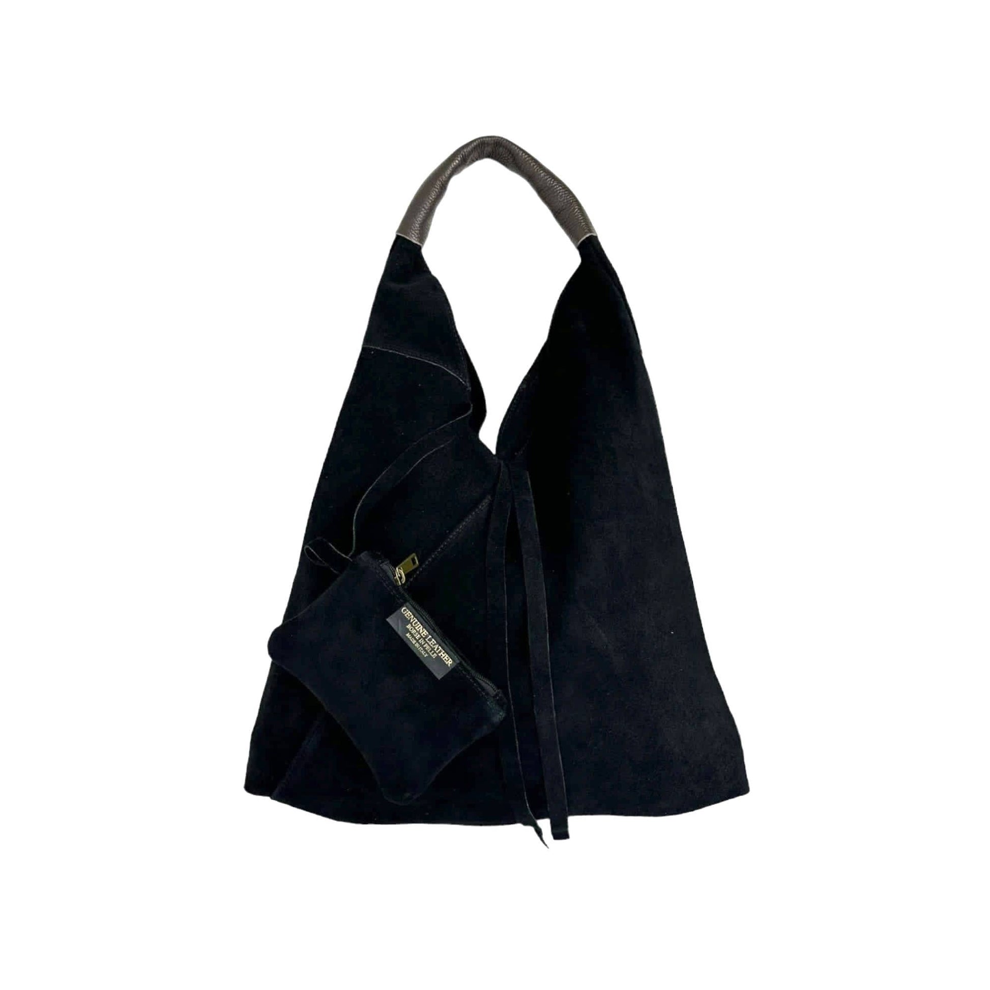 Wide Suede Leather Shoulder Bag with Extra Coin Purse. Material: Suede Leather. Closure of the extra coin purse: Zipper Interior: Large Capacity. Single compartment. Shoulder bag dimensions (width x length x height): 38 x 1 x 47 cm. Coin purse dimensions (width x length x height): 15.5 x 1 x 11 cm. Made in Italy. More surprises: Comes with a short strap for comfortable shoulder carrying.