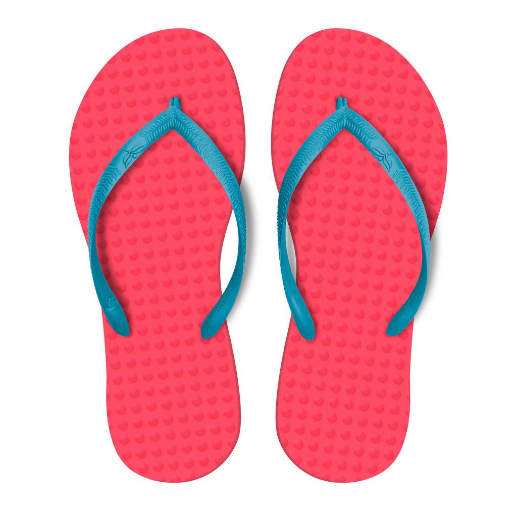 Watermelon sole with Turquoise straps recyclable flip flop, made with plant based plasticizers, active grip and slip resistant sole. Half size? We suggest you size up.